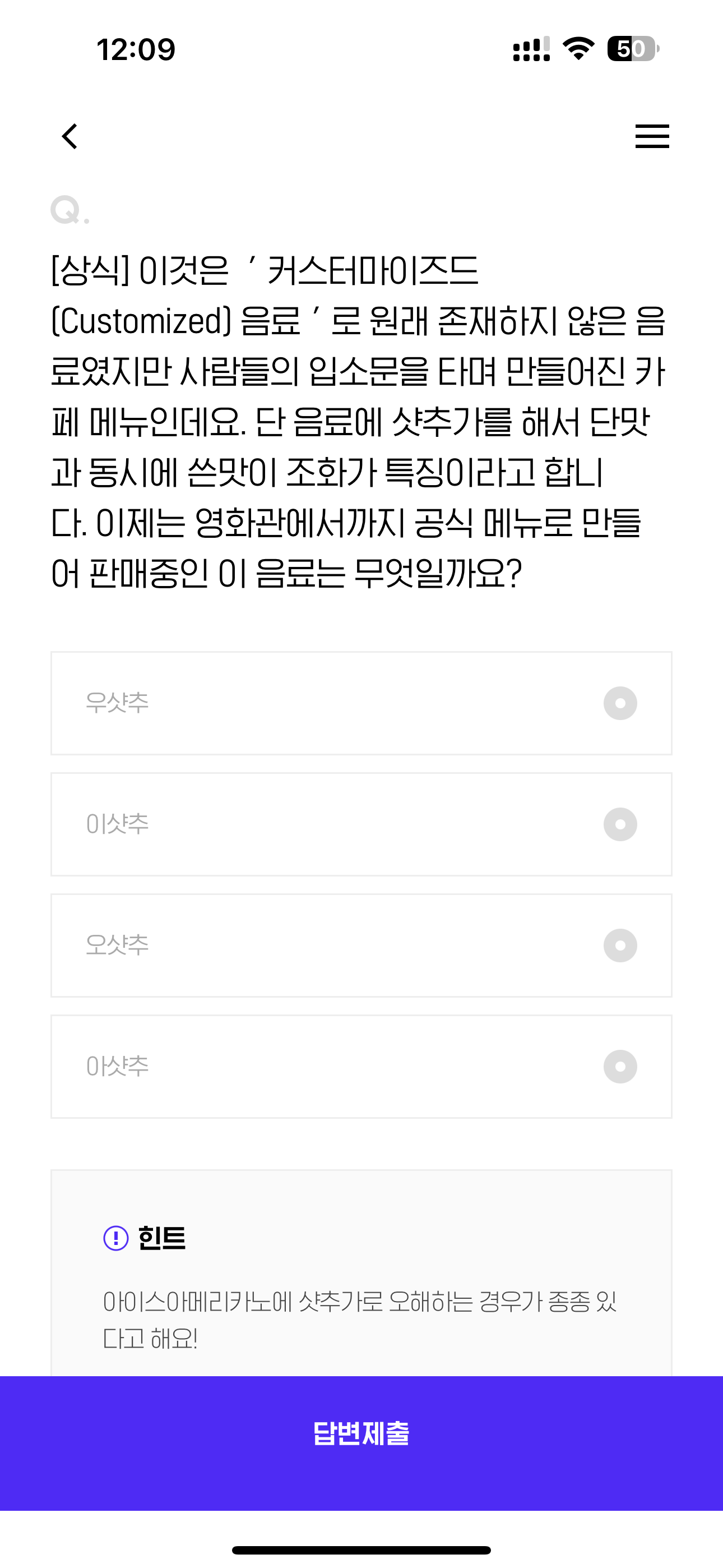 [상식] 이것은  ' 커스터마이즈(Customized) 음료 ' 로 원래 존재하지 않은 음료였지만 사람들의 입소문을 타며 만들어진 카페 메뉴인데요. 단 음료에 샷추가를 해서 단맛과 동시에 쓴맛이 조화가 특징이라고 합니다. 이제는 영화관에서까지 공식 메뉴로 만들어 판매중인 이 음료는 무엇일까요? 보기는 1. 우샷추 2. 이샷추 3. 오샷추 4. 아샷추 입니다
