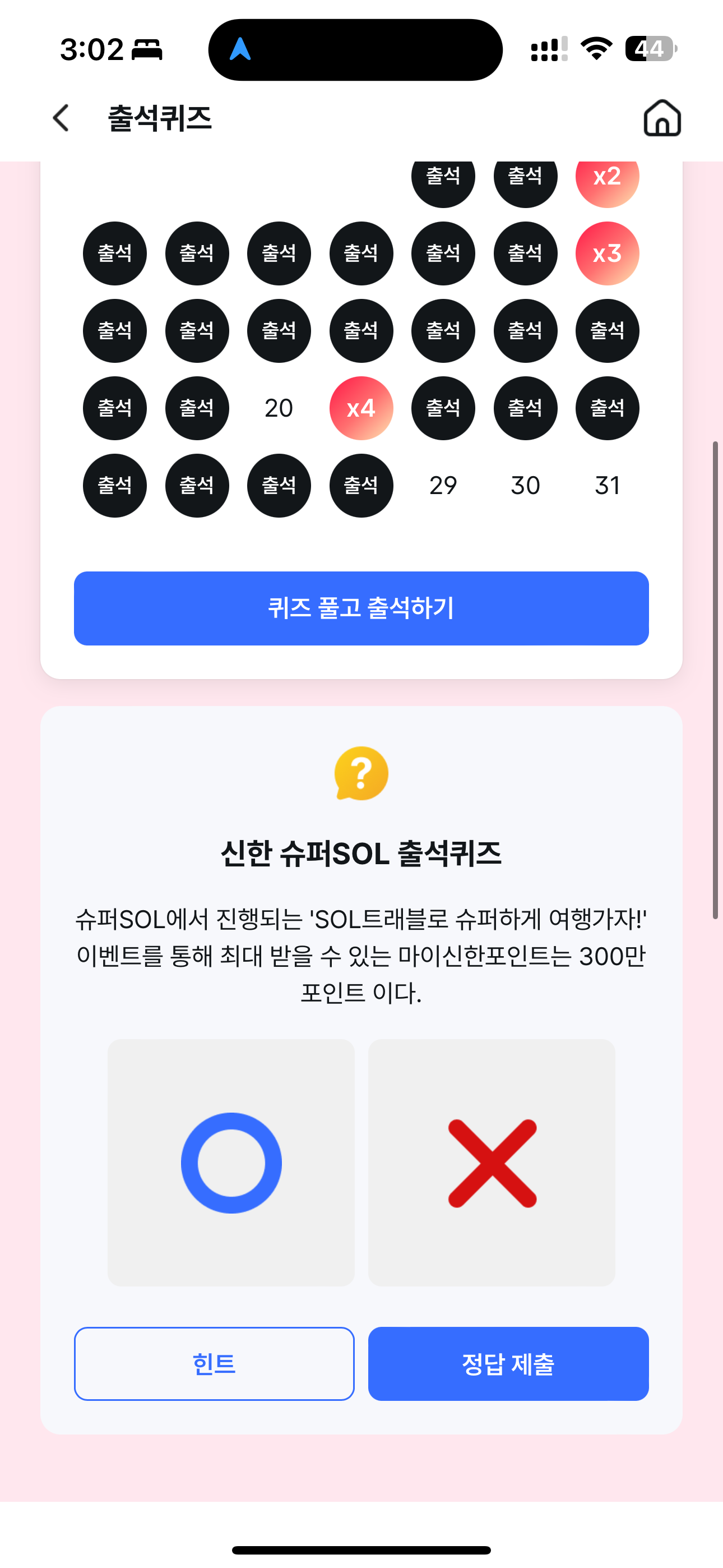 신한 슈퍼SOL 출석퀴즈 정답은 O 입니다
