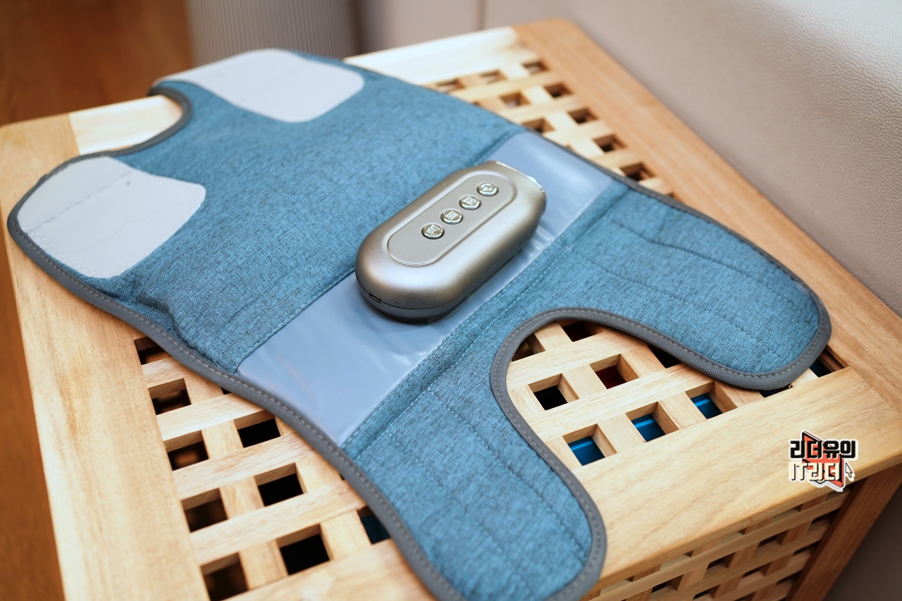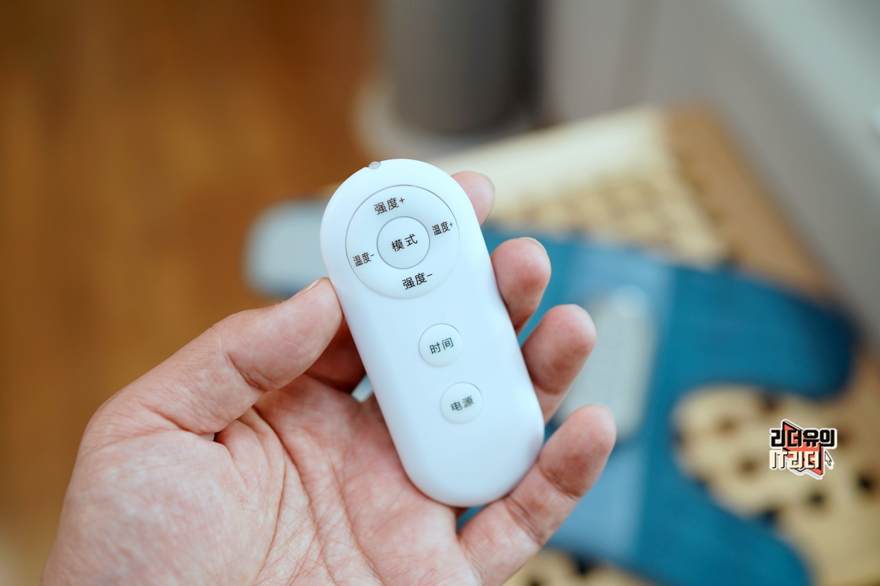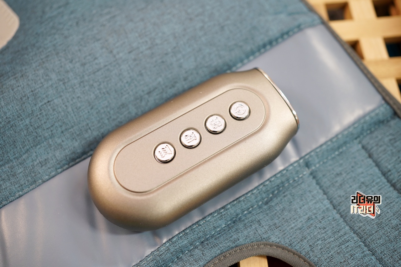 그리고 컨트롤 본체가 부착되어 있습니다. 전원 버튼, 모드, 강도 조절, 온열 조절 버튼이 있습니다. 리모컨이 있어서 전원 버튼만 사용하고 나머지는 사용하지 않습니다. 참고로 전원은 리모컨으로 켜지지 않고 꼭 본체에서 눌러줘야 합니다.
