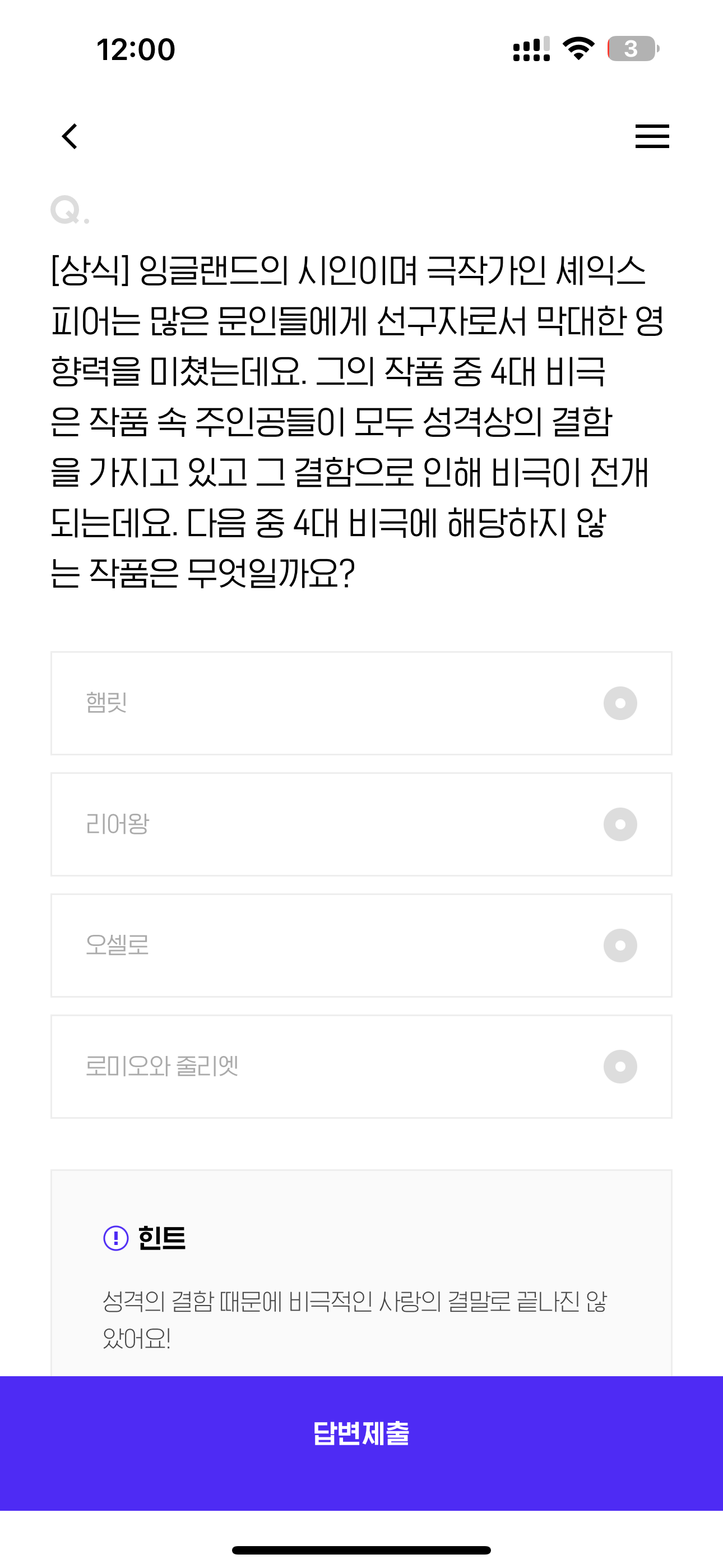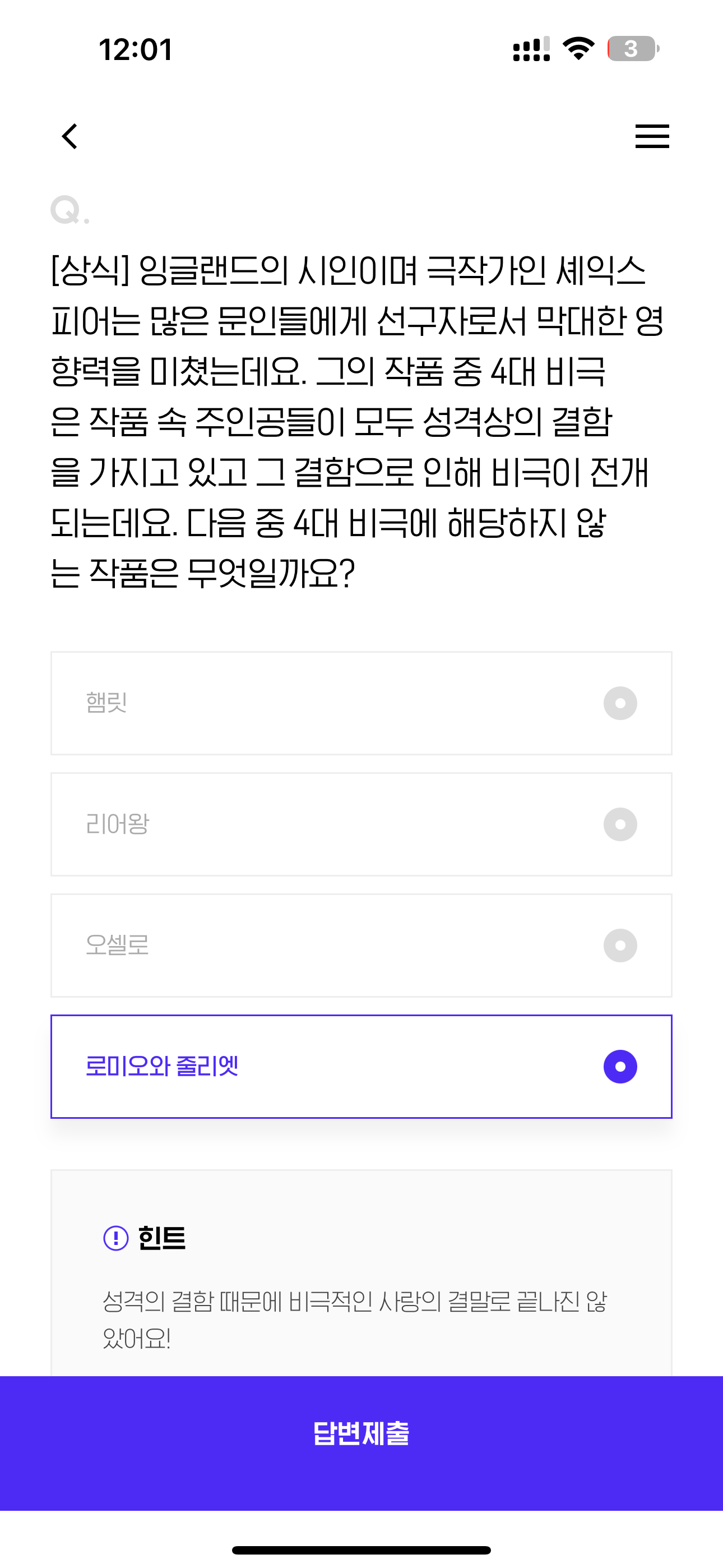 [상식] 잉글랜드의 시인이며 극작가인 셰익스피어는 많은 문인들에게 선구자로서 막대한 영향력을 미쳤는데요. 그의 작품 중 4대 비극은 작품 속 주인공들이 모두 성격상의 결함을 가지고 있고 그 결함으로 인해 비극이 전개되는데요. 다음 중 4대 비극에 해당하지 않는 작품은 무엇일까요? 보기는 1. 햄릿 2. 리어왕 3. 오셀로 4. 로미오와 줄리엣 입니다
