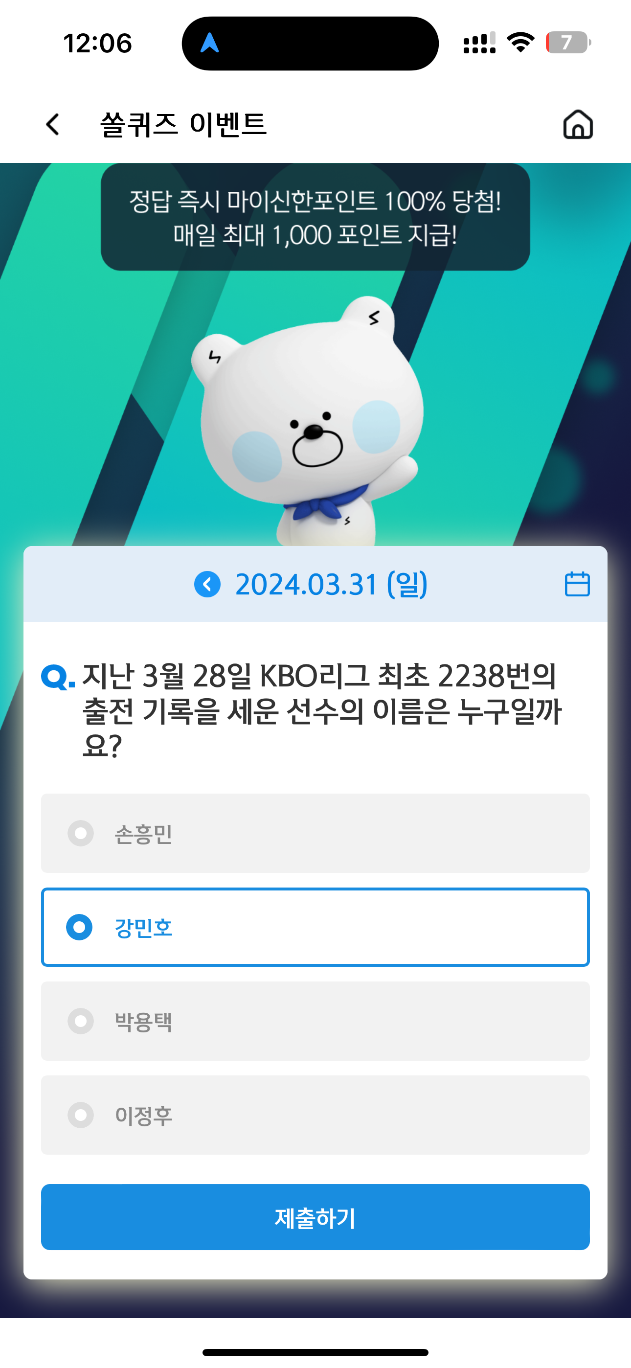 신한 슈퍼SOL 야구/상식 쏠퀴즈 정답은 강민호 입니다