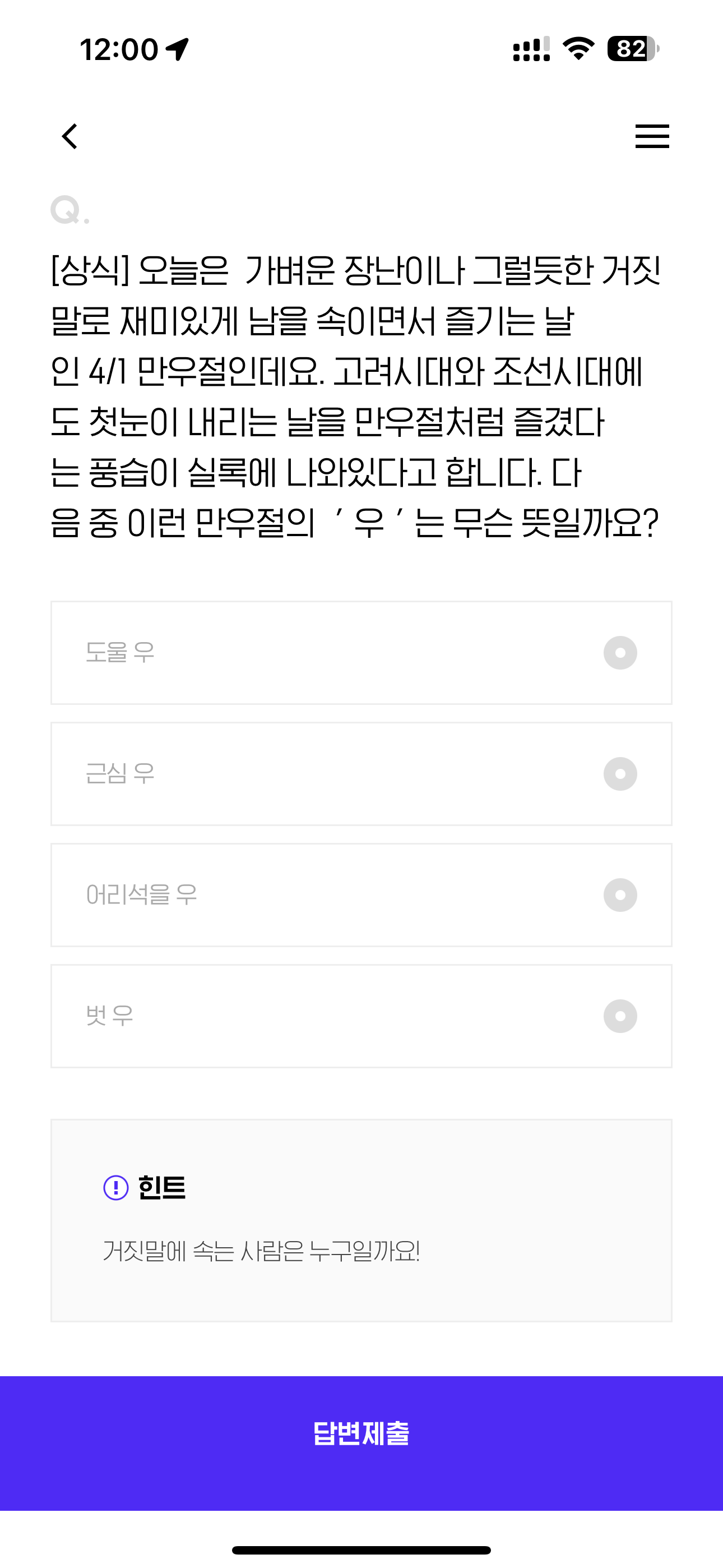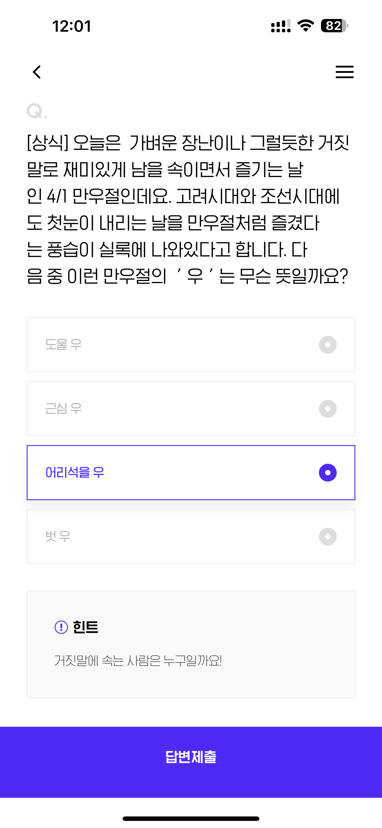 [상식] 오늘은 가벼운 장난이나 그럴듯한 거짓말로 재미있게 남을 속이면서 즐기는 날인 4/1 만우절인데요. 고려시대와 조선시대에도 첫눈이 내리는 날을 만우절처럼 즐겼다는 풍습이 실록에 나와있다고 합니다. 다음 중 이런 만우절의 ' 우 ' 는 무슨 뜻일까요? 보기는 1. 도울 우 2. 근심 우 3. 어리석을 우 4. 벗 우 입니다
