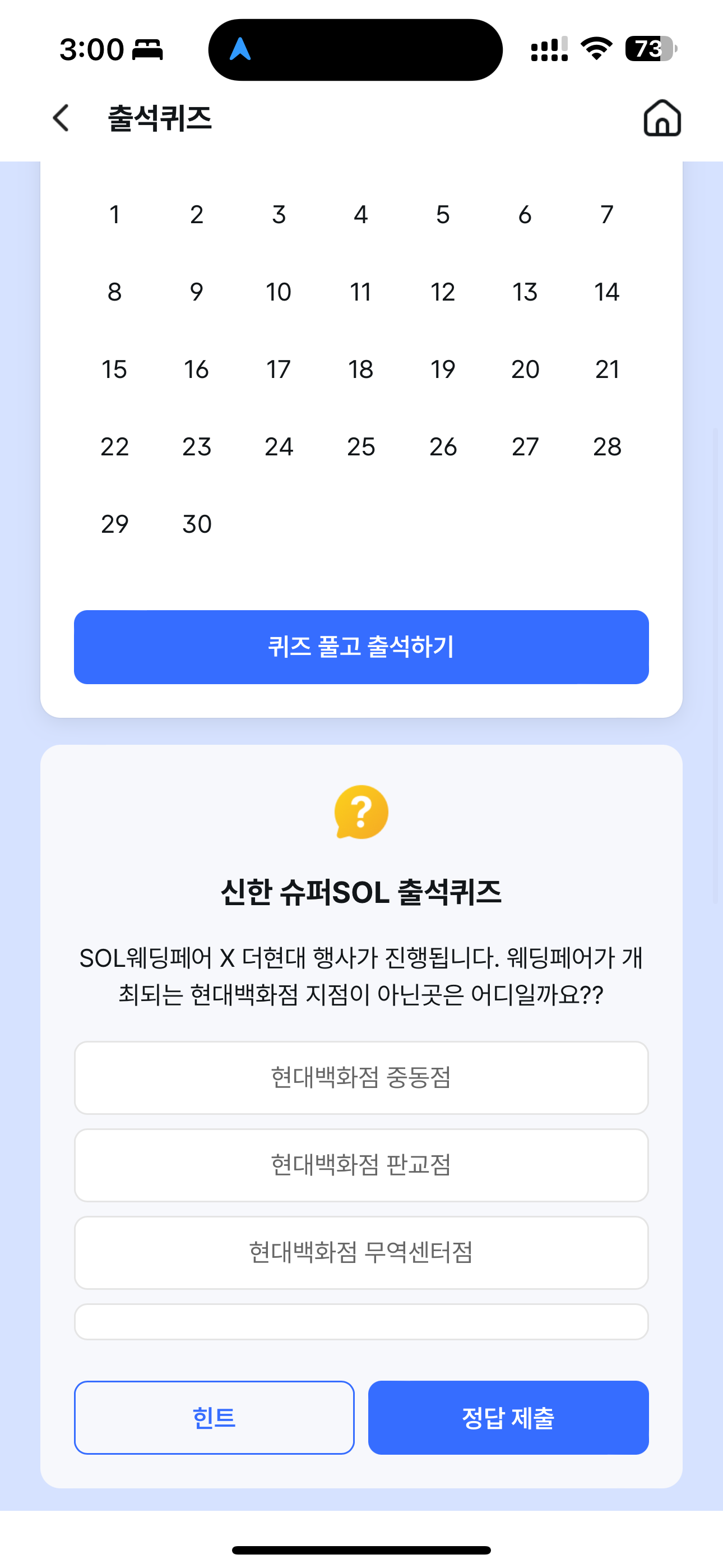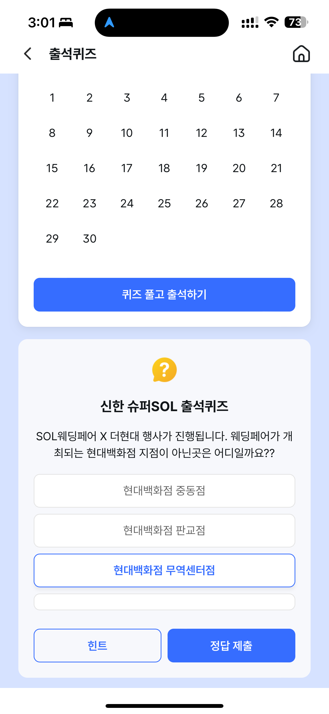 신한 슈퍼SOL 출석퀴즈 정답은 현대백화점 무역센터점 입니다