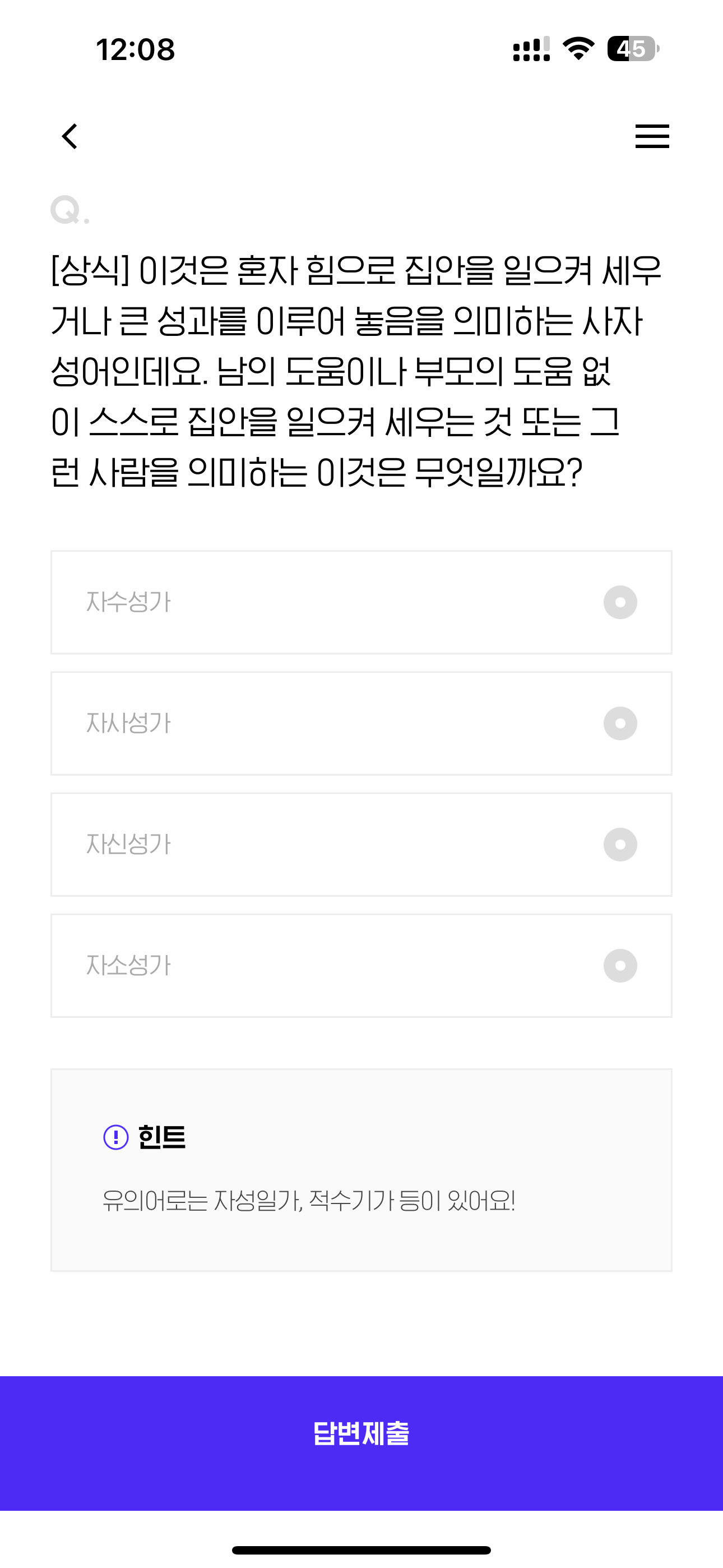 [상식] 이것은 혼자 힘으로 집안을 일으켜 세우거나 큰 성과를 이루어 놓음을 의미하는 사자성어인데요. 남의 도움이나 부모의 도움 없이 스스로 집안을 일으켜 세우는 것 또는 그런 사람을 의미하는 이것은 무엇일까요? 보기는 1. 자수성가 2. 자사성가 3. 자신성가 4. 자소성가 입니다.