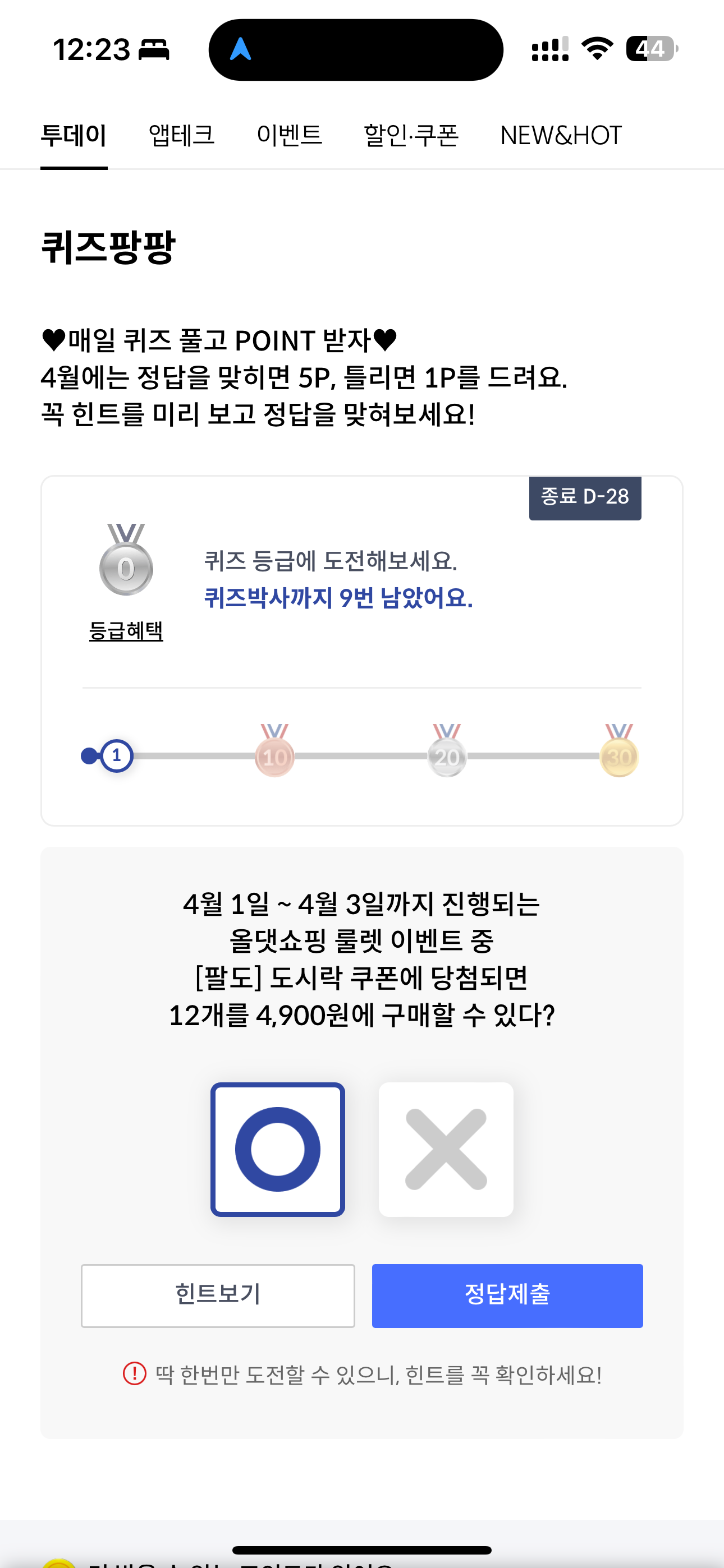 4월 1일 ~ 4월 3일까지 진행되는 올댓쇼핑 룰렛 이벤트 중 [팔도] 도시락 쿠폰에 당첨되면 12개를 4,900원에 구매할 수 있다? O, X 퀴즈인데요. 올댓쇼핑 룰렛 이벤트 가면 최대 64% 할인 이벤트가 열리고 있습니다. 다양한 제품을 저렴하게 구입할 수 있는 기회이니 참여해 보세요