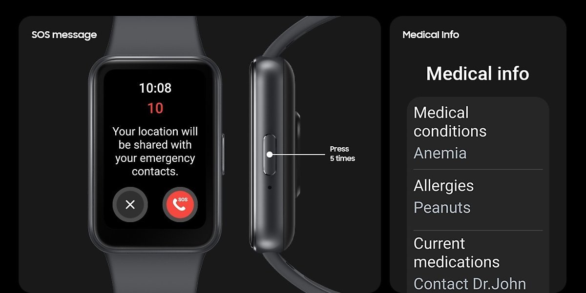 삼성 갤럭시핏3는 넘어졌을때 낙상을 감지해 긴급 SOS 기능을 지원합니다. 다만 이 기능은 One UI 6.1 이상의 갤럭시 스마트폰에서만 가능하다고 합니다. 그리고 사이드 버튼을 5번 누르면 SOS 메시지 발송 기능도 가지고 있습니다.