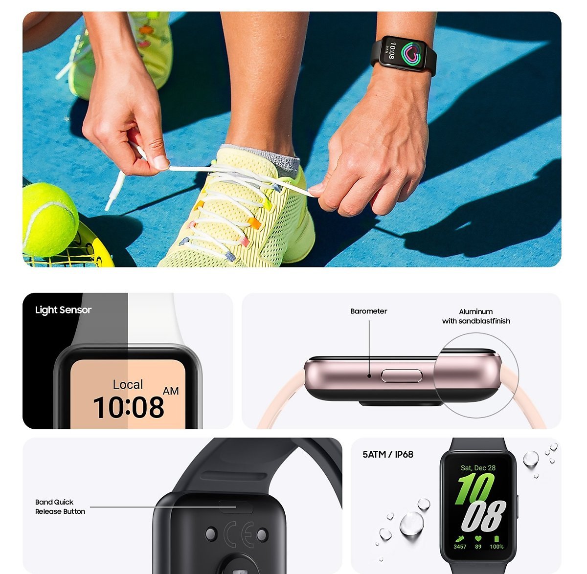 삼성 갤럭시핏3는 수영이나 물놀이 중에도 사용할 수 있는 5ATM 방수를 지원합니다. 이는 수심 50m 까지 방수가 되는 성능이라 물로부터 자유롭게 사용할 수 있습니다.