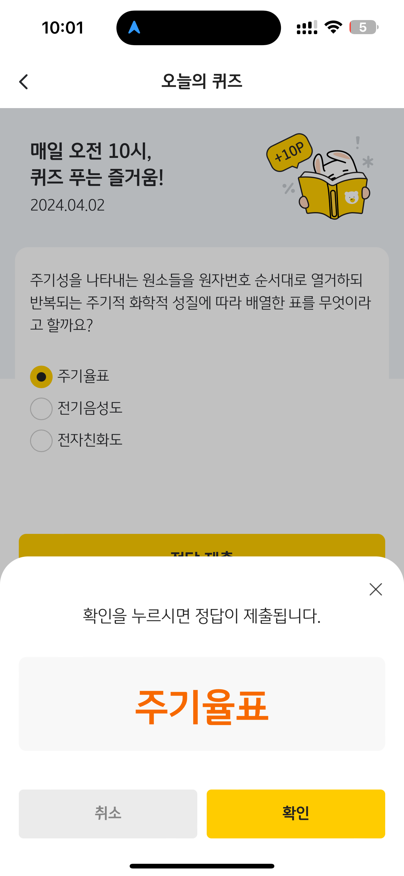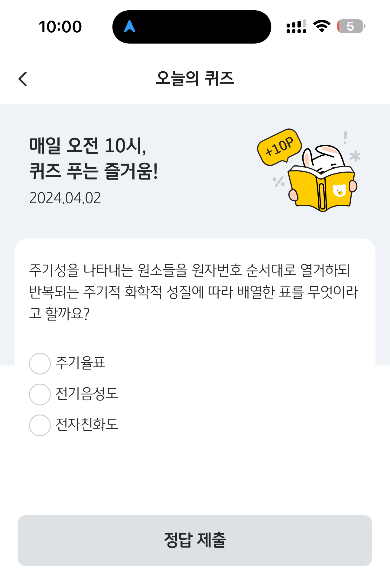 KB Pay 오늘의 퀴즈 정답은 주기율표 입니다