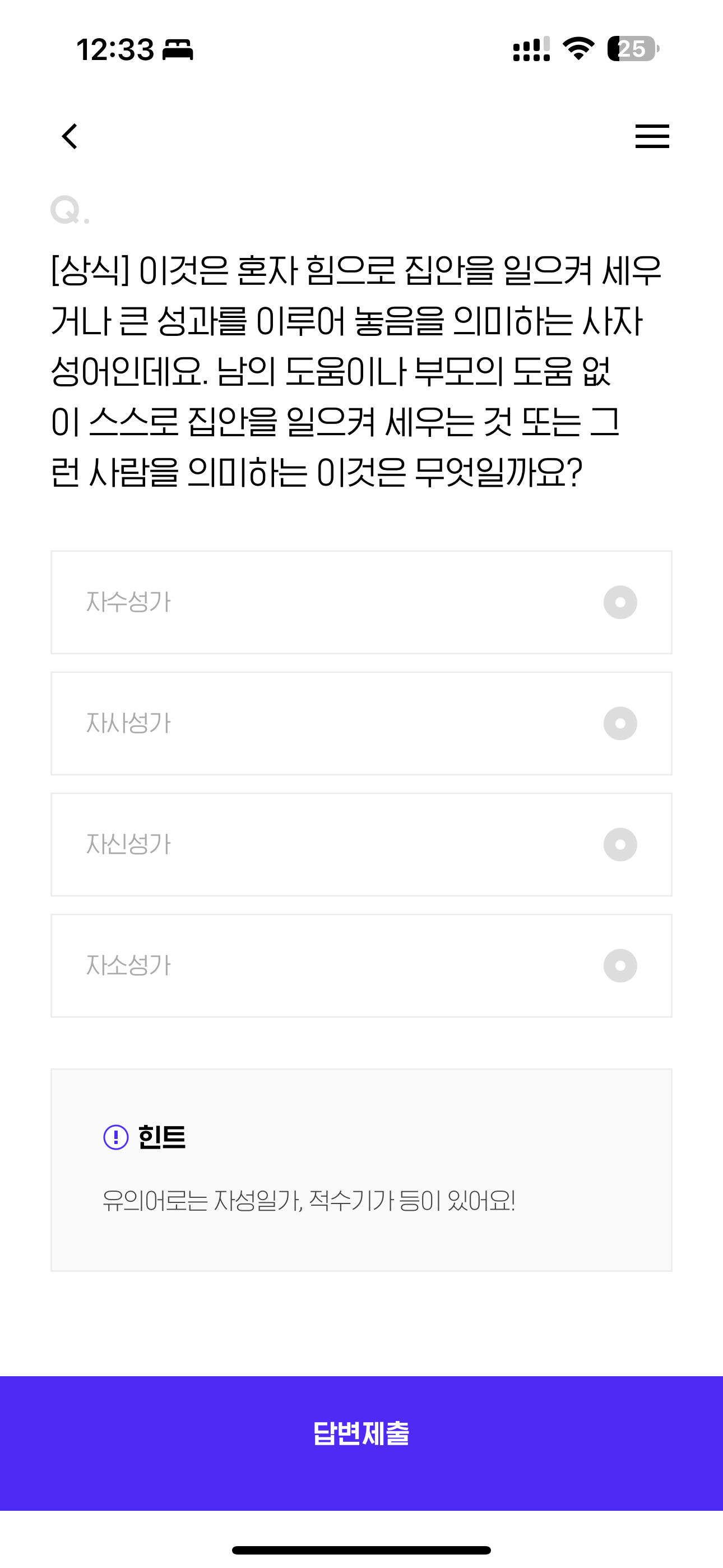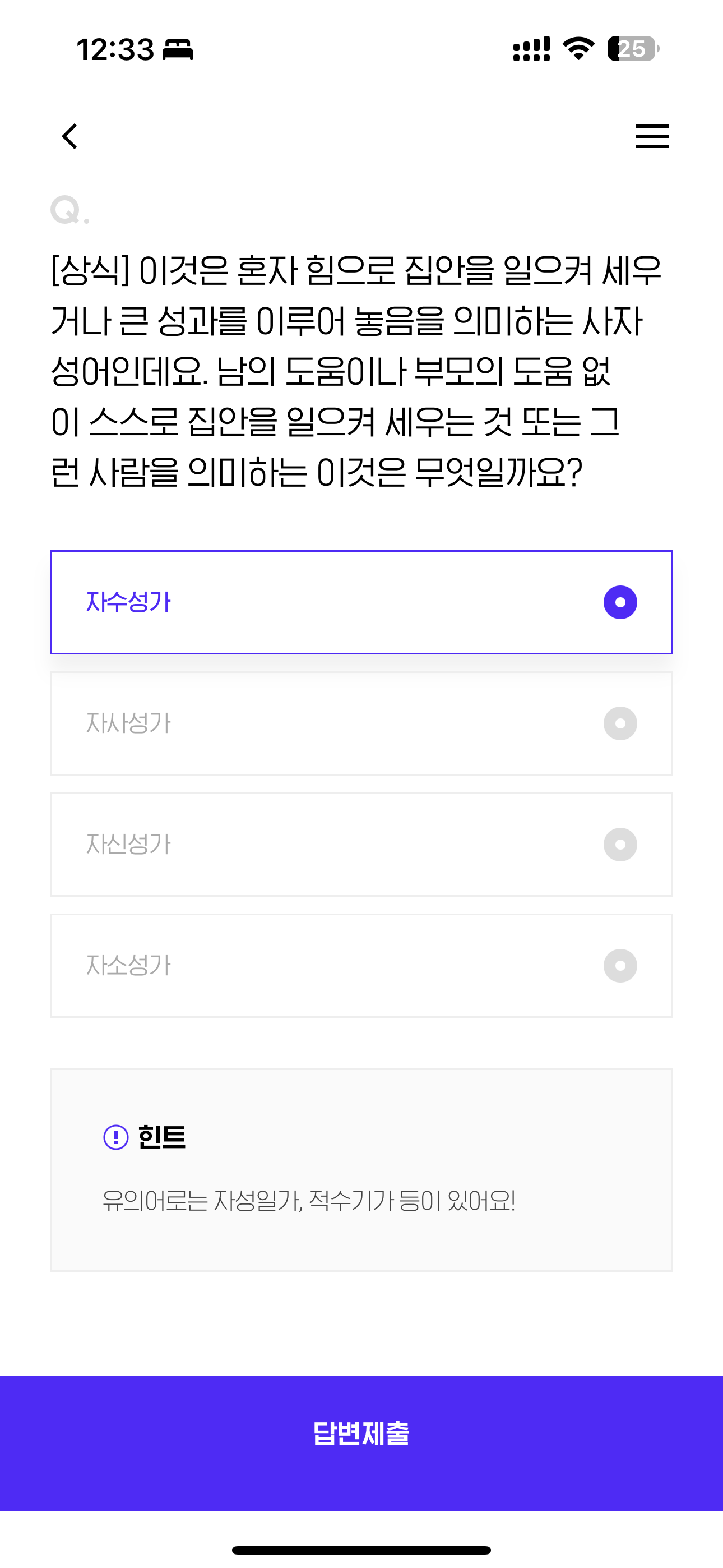 [상식] 이것은 혼자 힘으로 집안을 일으켜 세우거나 큰 성과를 이루어 놓음을 의미하는 사자성어인데요. 남의 도움이나 부모의 도움 없이 스스로 집안을 일으켜 세우는 것 또는 그런 사람을 의미하는 이것은 무엇일까요? 보기는 1. 자수성가 2. 자사성가 3. 자신성가 4. 자소성가 입니다