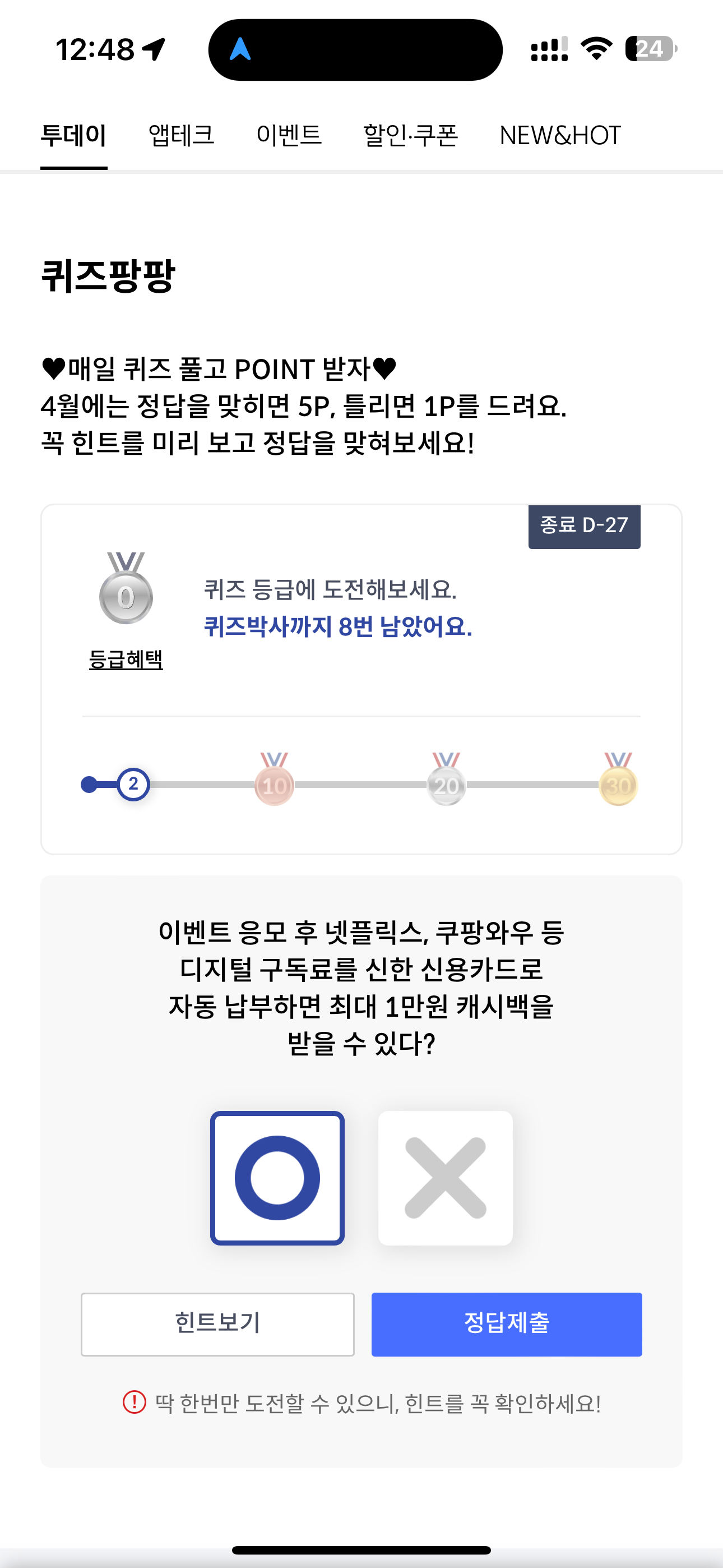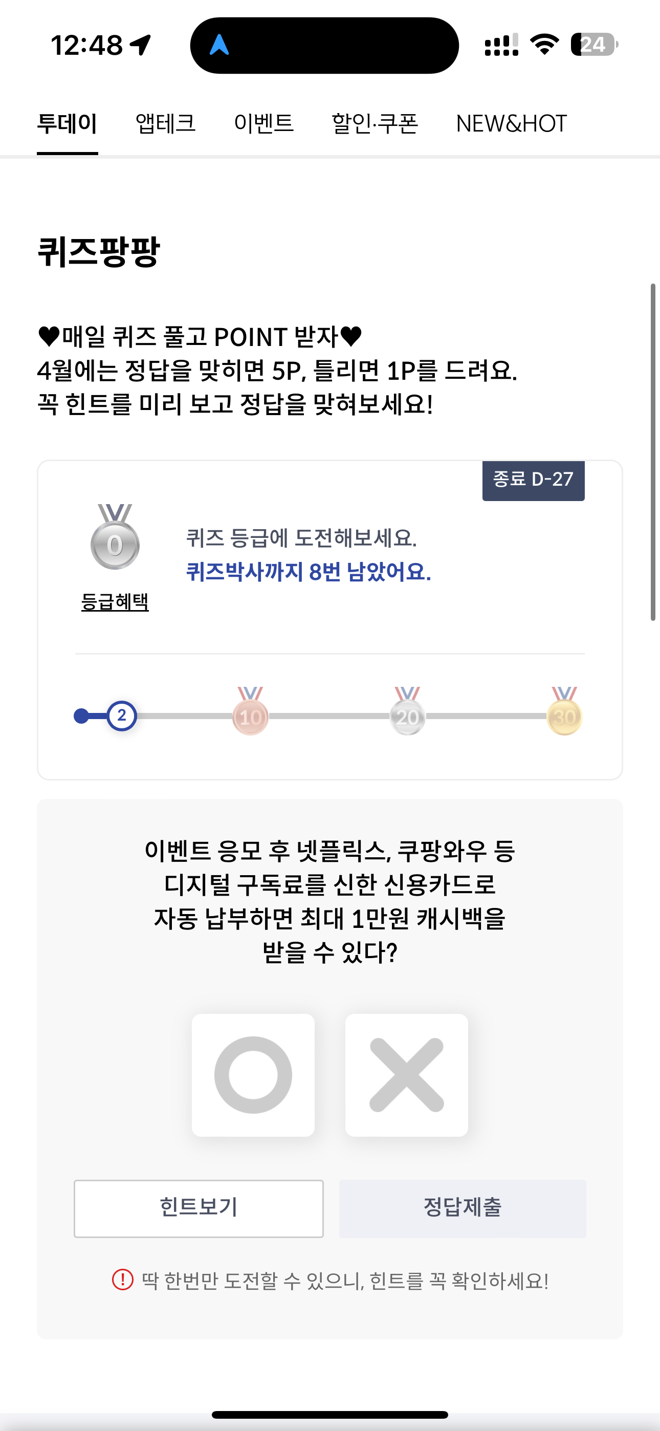 신한카드 퀴즈팡팡 정답은 O 입니다