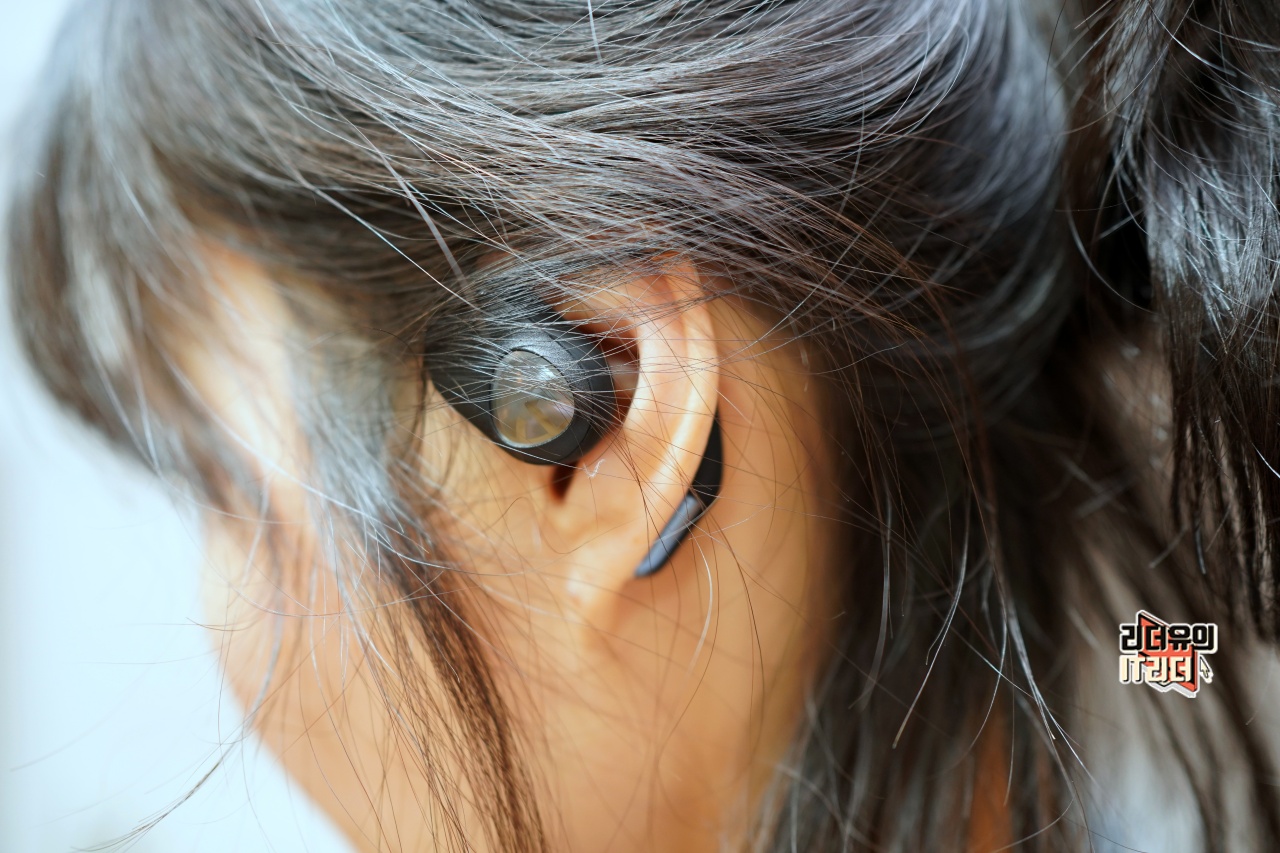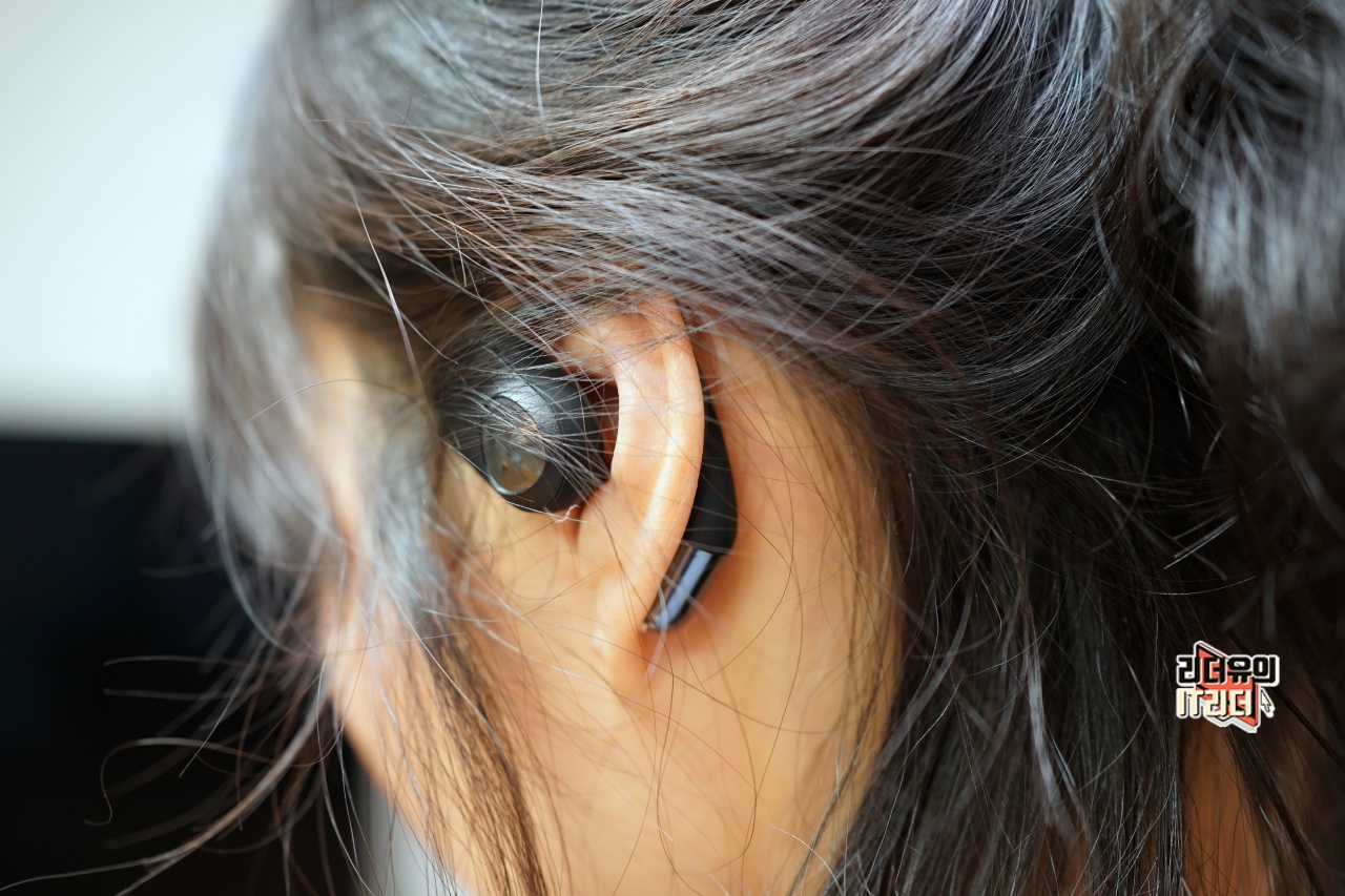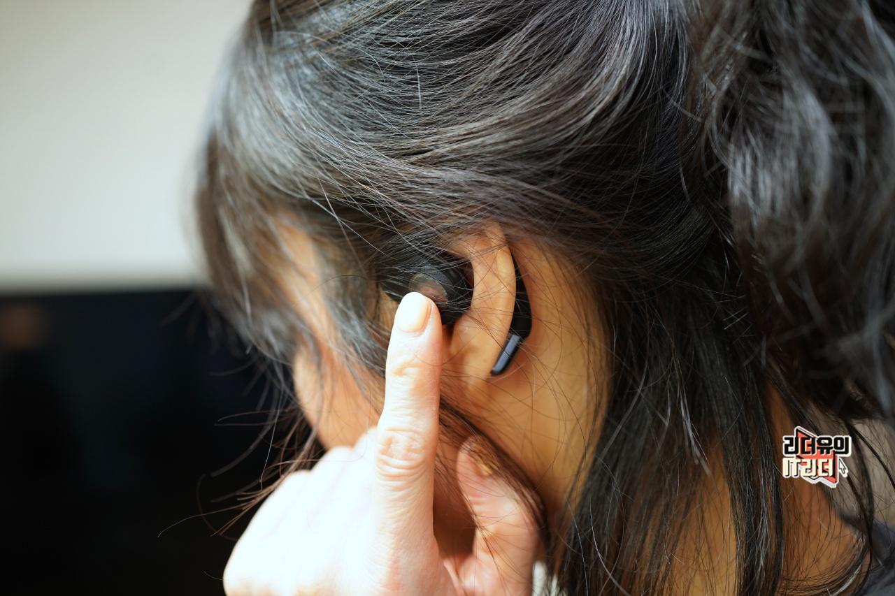 사운드피츠 고프리2를 귀에 장착한 모습입니다. 누가 착용해도 편하게 착용할 수 있는 디자인입니다.