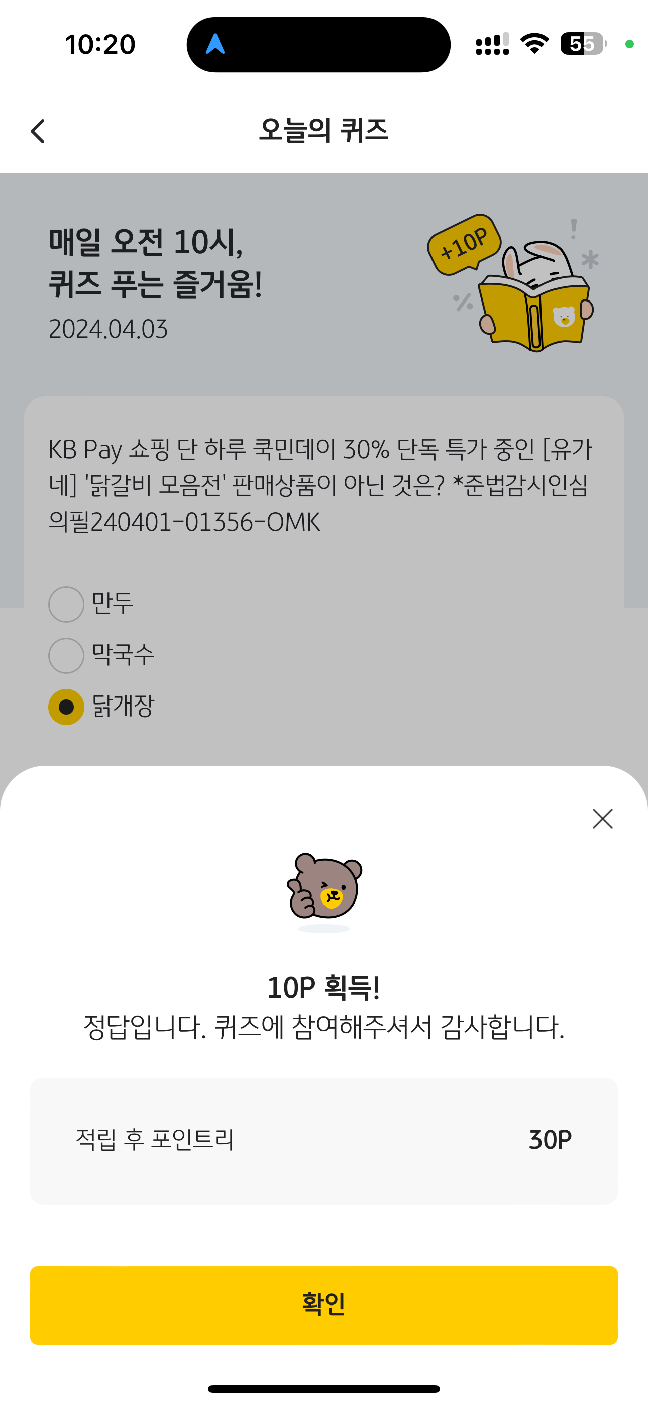 KB Pay 오늘의 퀴즈 정답은 닭개장 입니다