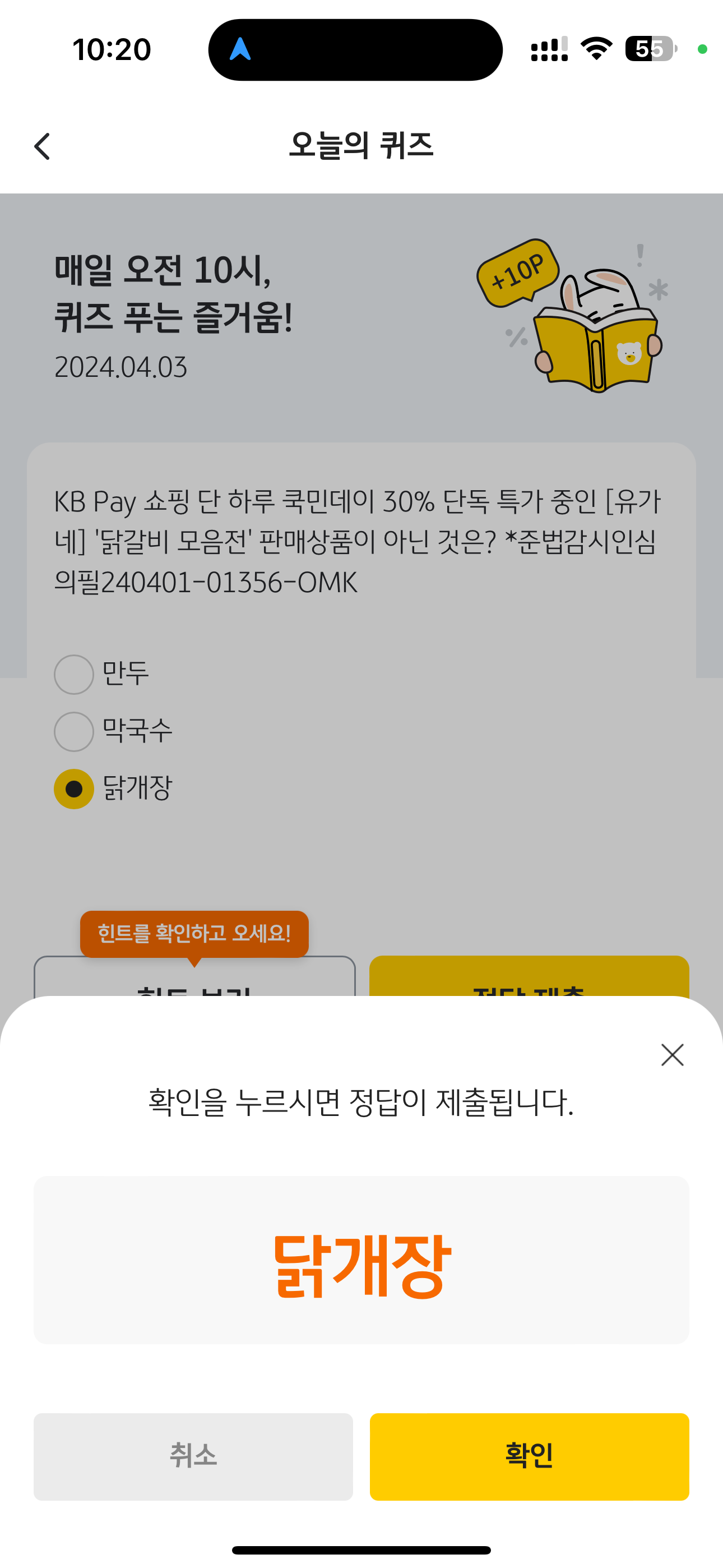 KB Pay 오늘의 퀴즈 정답은 닭개장 입니다