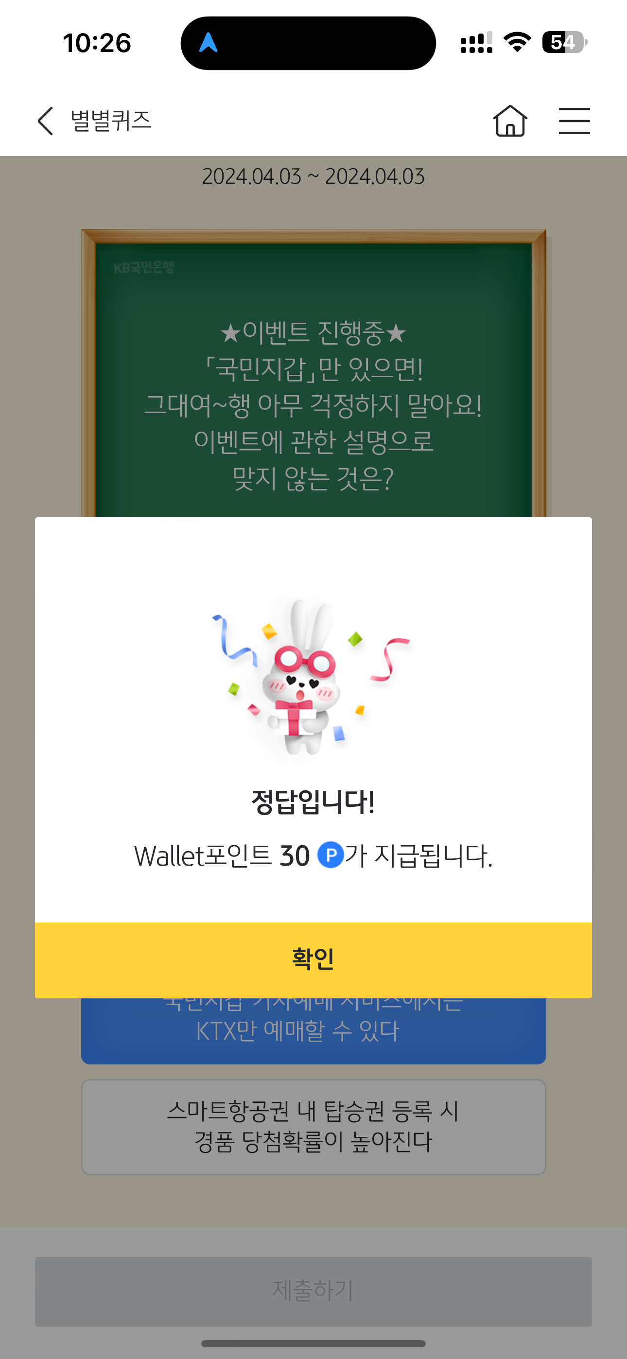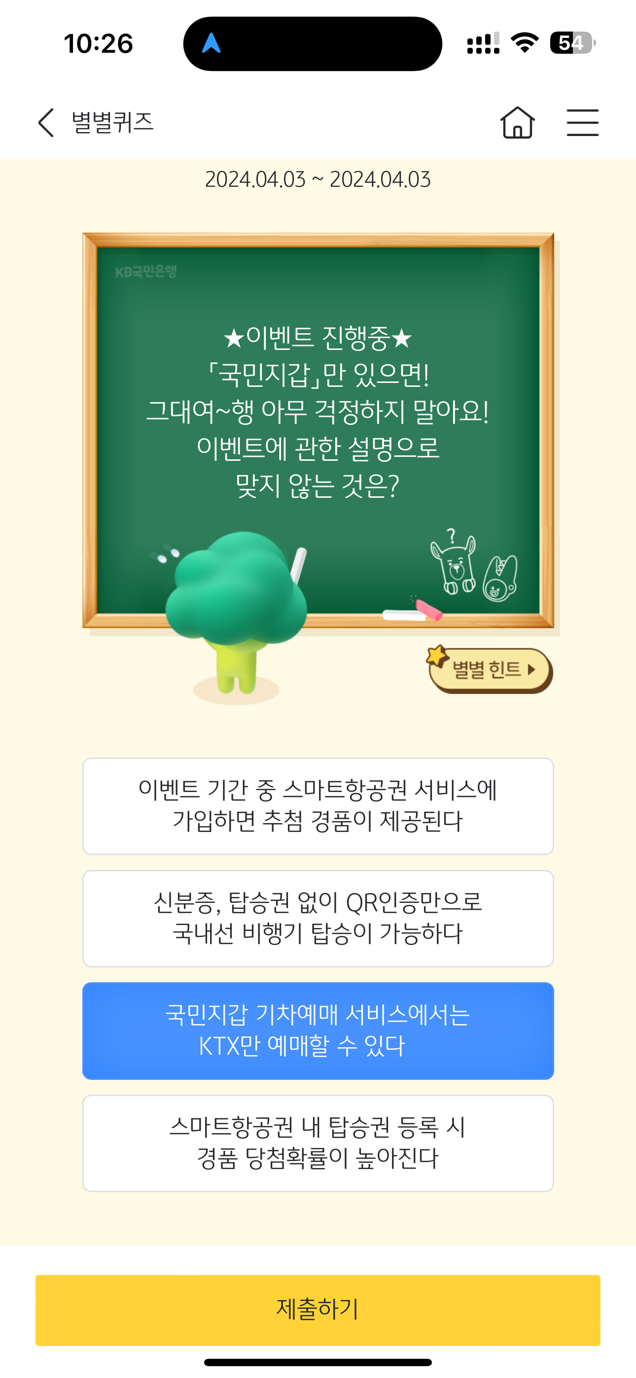 KB스타뱅킹 별별퀴즈 정답은 국민지갑 기차예매 서비스에서는 KTX만 예매할 수 있다 입니다