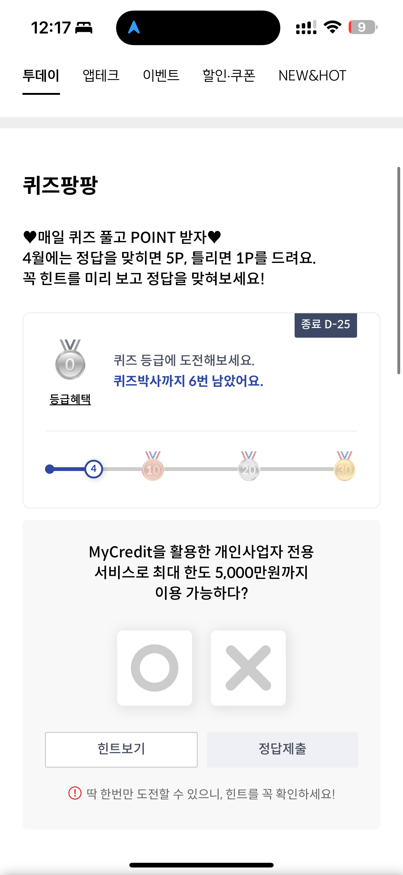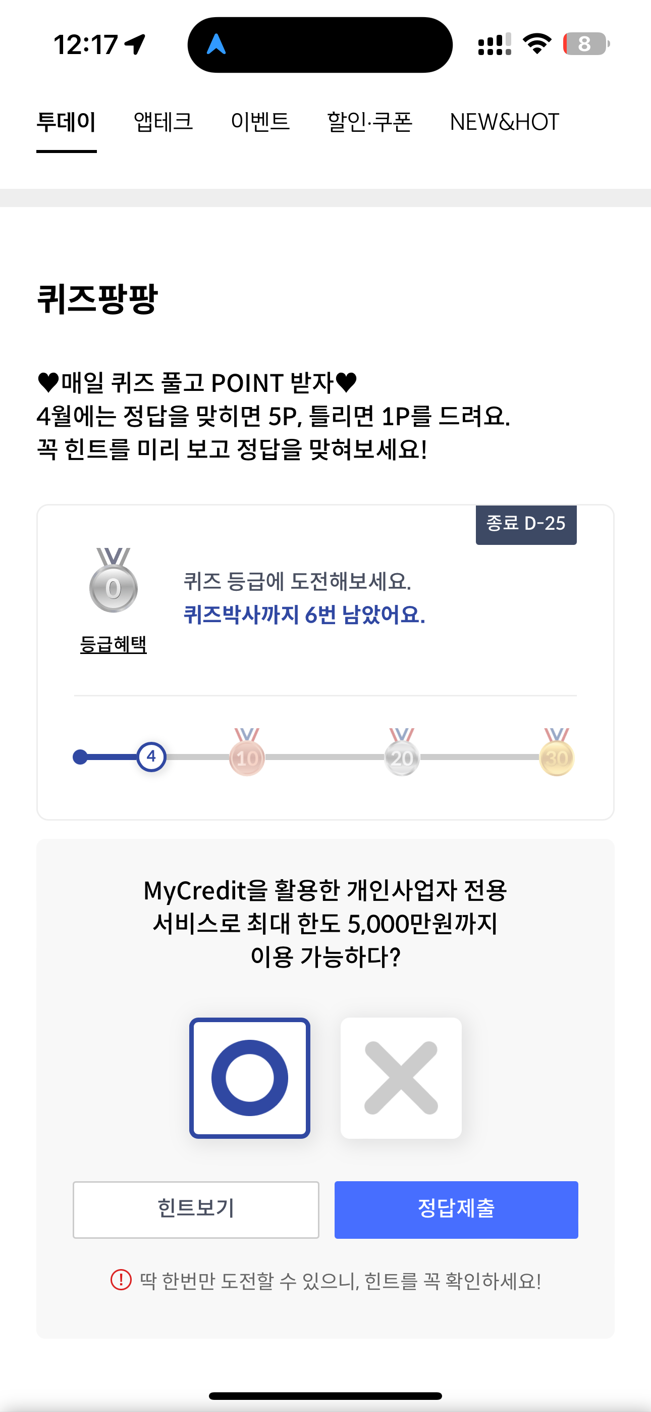 MyCredit을 활용한 개인사업자 전용서비스로 최대 한도 5,000만원까지 이용 가능하다? O, X 퀴즈인데요. MyCredit은 개인사업자들의 자금을 위한 서비스로 급하게 돈이 필요할때 활용하시면 좋습니다. 다만 이자 부담도 크기 때문에 꼼꼼하게 확인해 보셔야 할 것 같습니다.