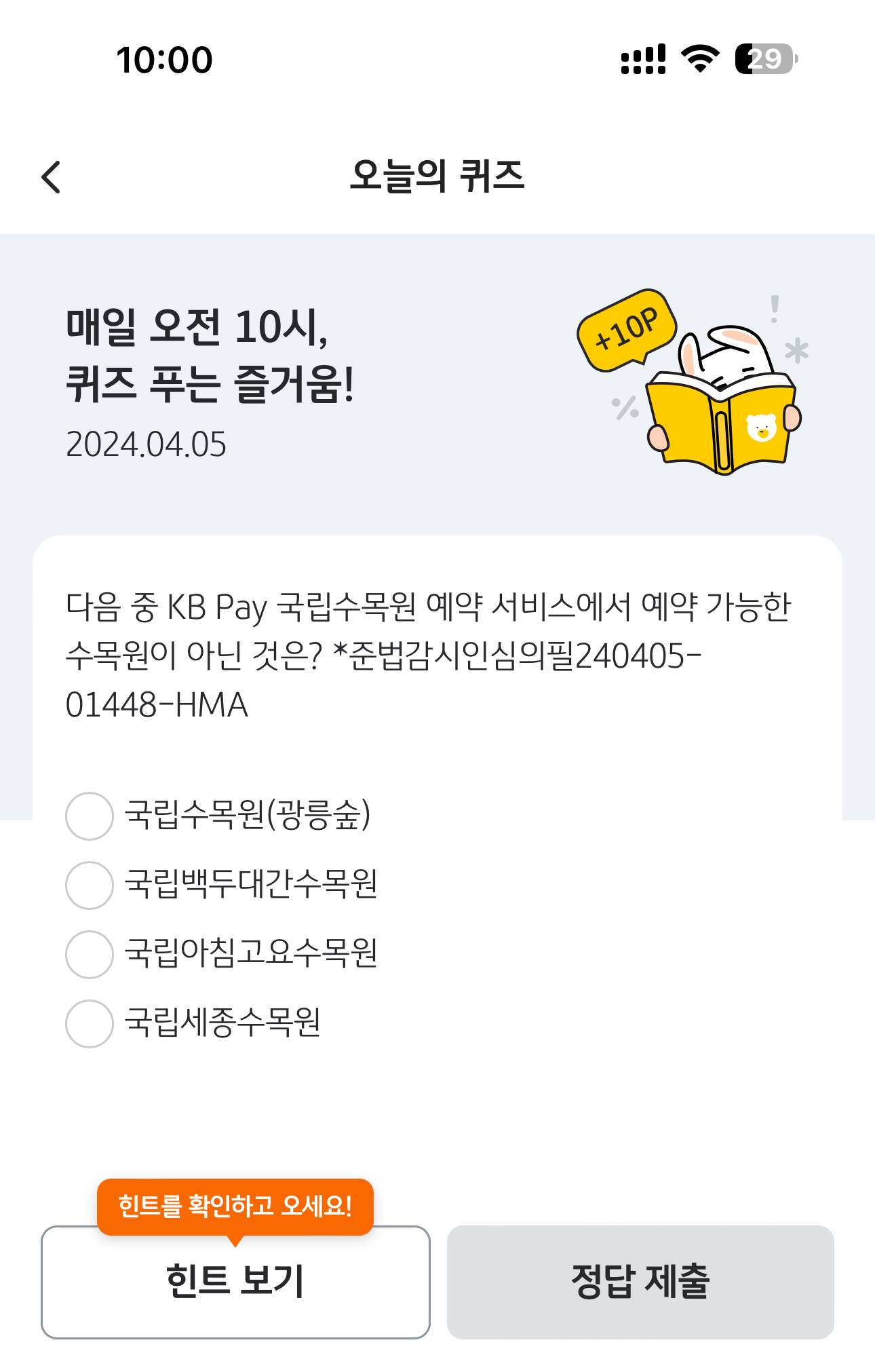 KB Pay 오늘의 퀴즈 4월 5일 정답(다음 중 KB Pay 국립수목원 예약 서비스에서 예약 가능한 수목원이 아닌 것은?)