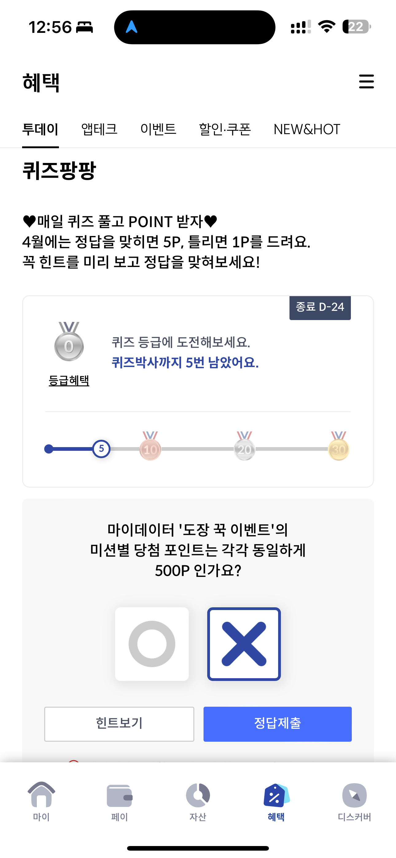 마이데이터 '도장 꾹 이벤트'의 미션별 당첨 포인트는 각각 동일하게 500P 인가요? O, X 퀴즈인데요. 현재 마이데이터 도장 꾹 이벤트로 단계별로 포인트를 주고 있습니다. 여러 단계가 있어 다 모으면 꽤 큰 포인트가 쌓일 것 같은데요. 500P 이상 주는 단계가 있을까요?