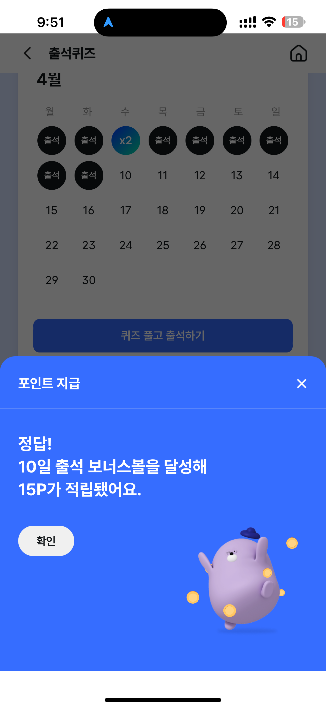 15P를 받았습니다. 포인트는 현금 전환 가능하니 꼭 받으시고요. 여러분의 재테크를 응원합니다