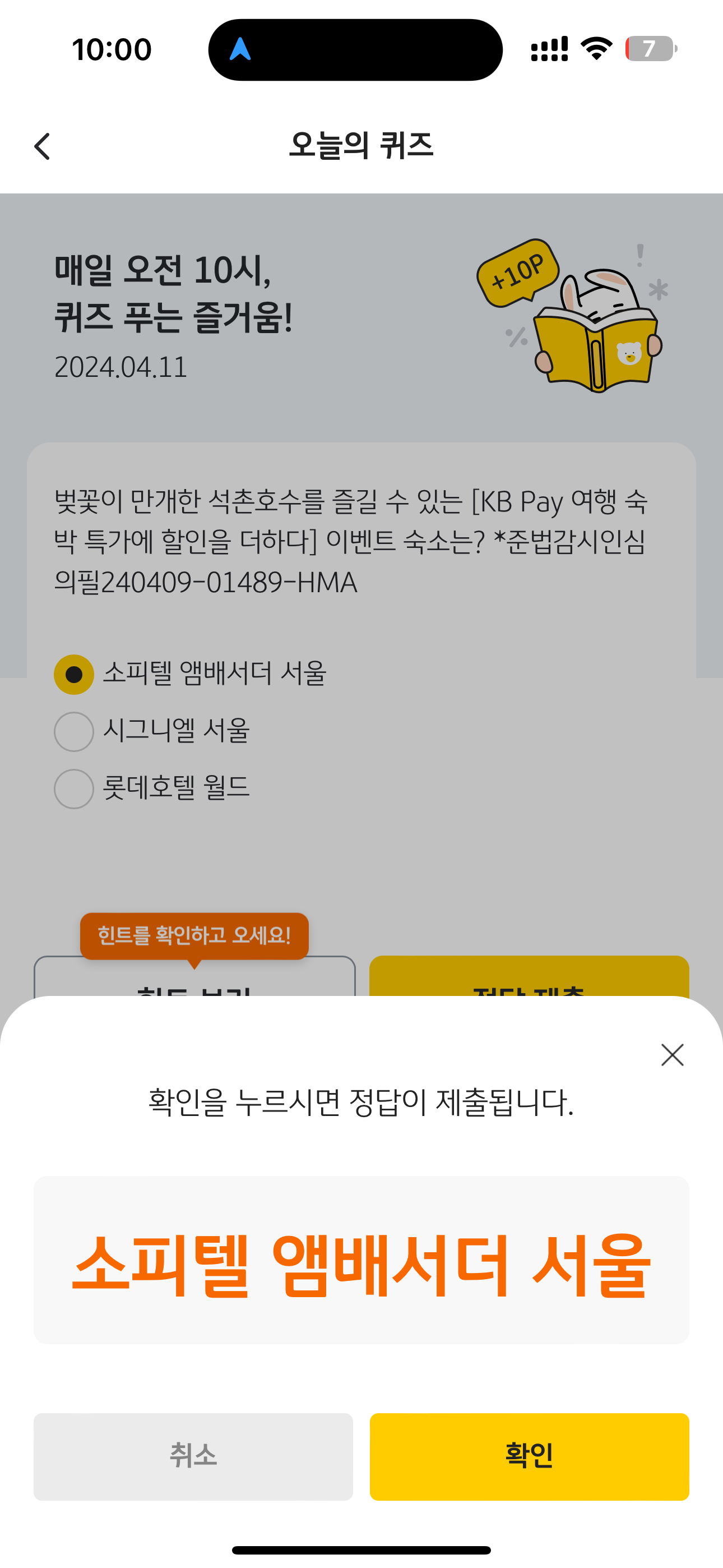 KB Pay 오늘의 퀴즈 정답은 소피텔 앰배서더 서울 입니다