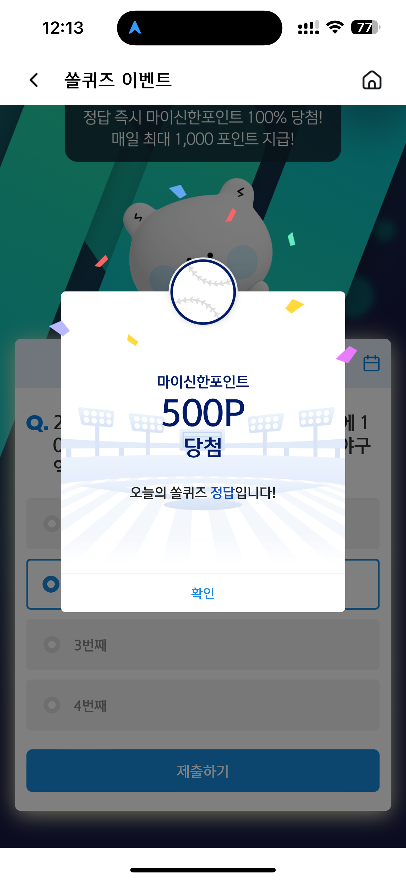 신한 슈퍼SOL 야구/상식 쏠퀴즈 정답은 2번째 입니다