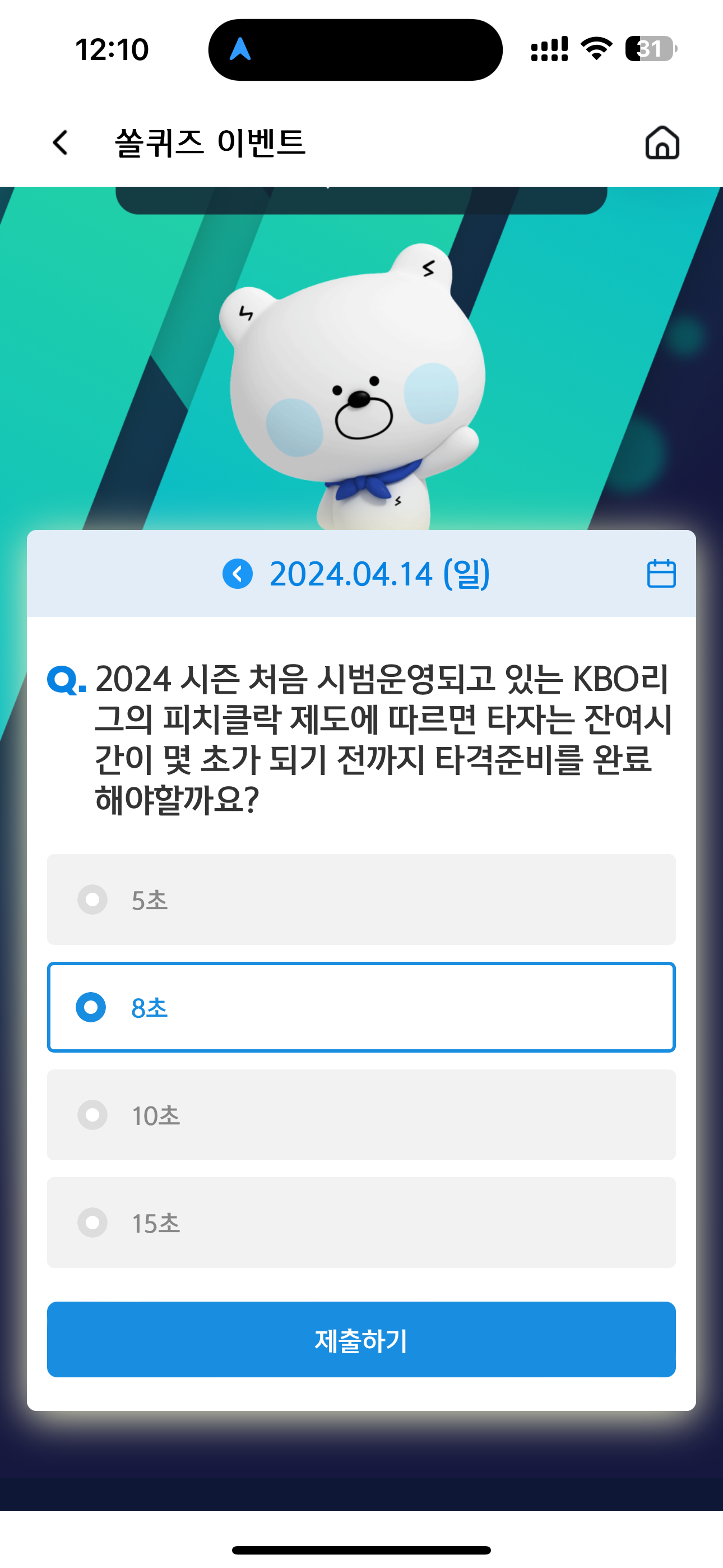 신한 슈퍼SOL 야구/상식 쏠퀴즈 정답은 8초 입니다