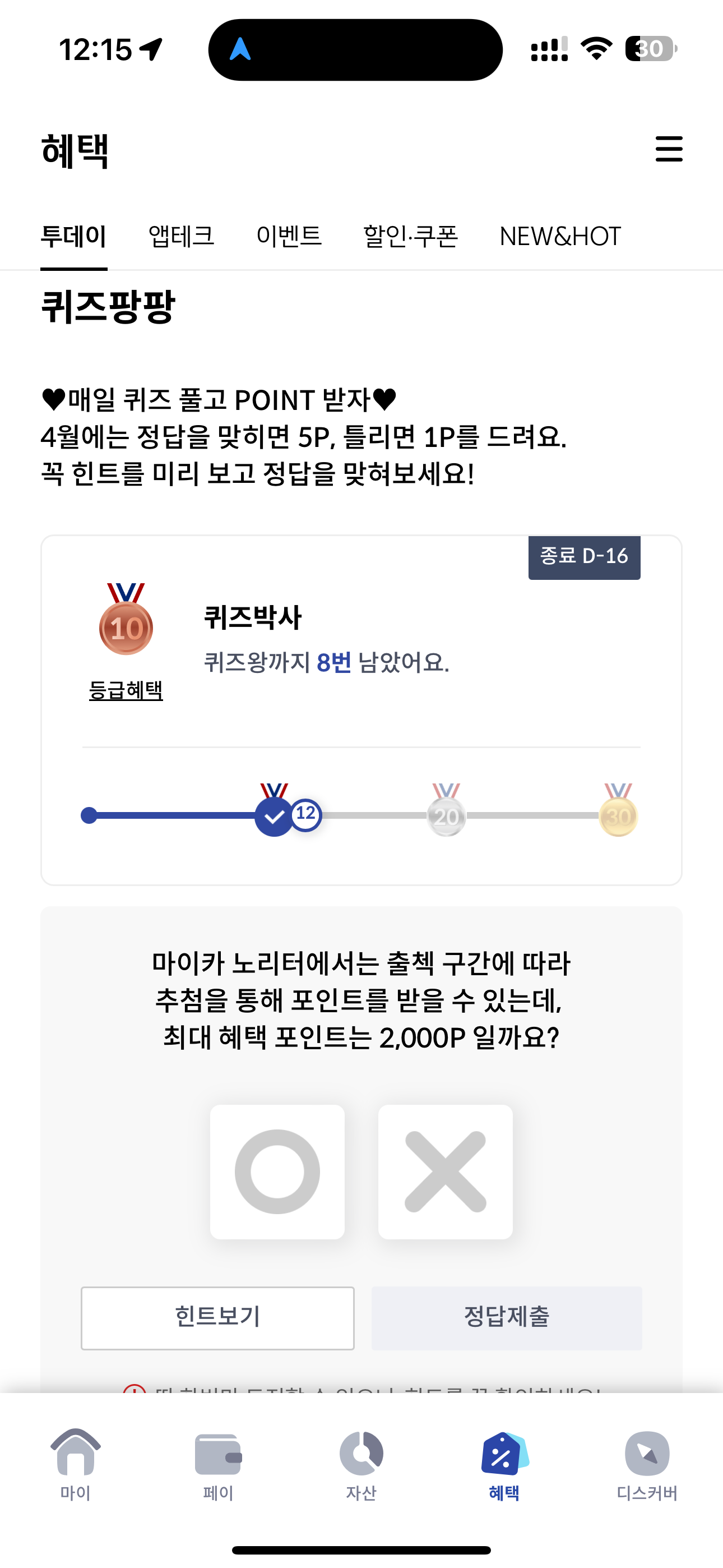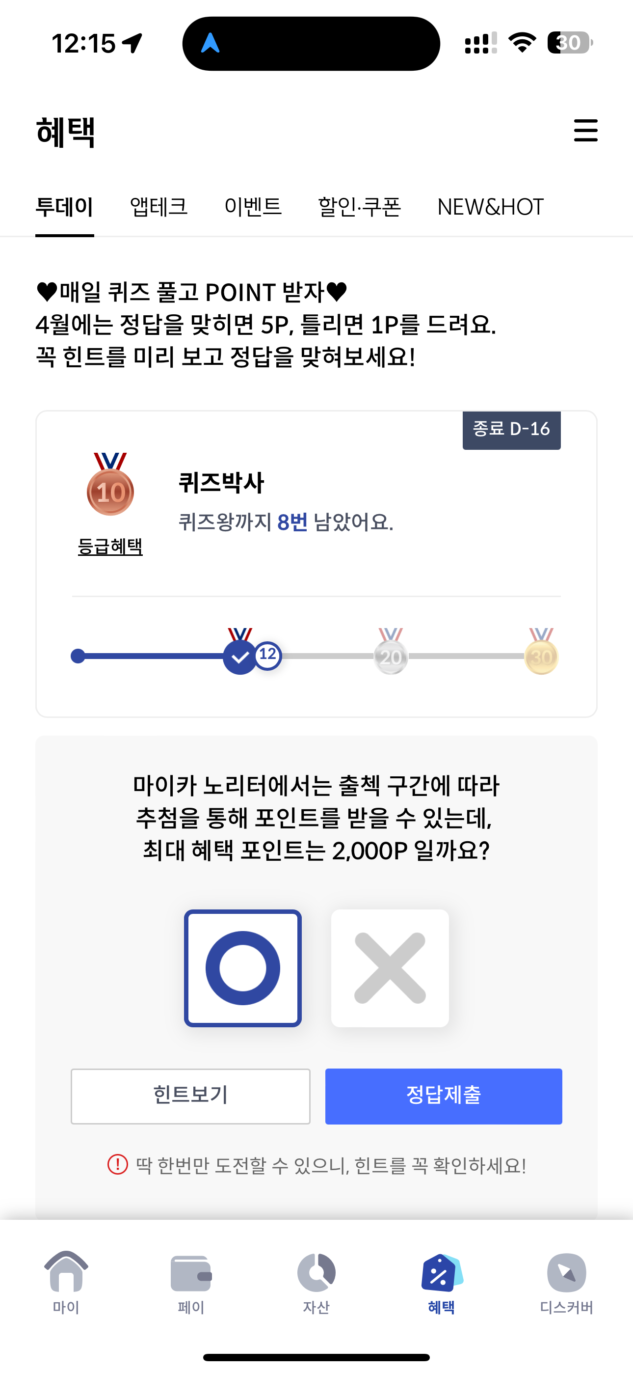 마이카 노리터에서는 출첵 구간에 따라 추첨을 통해 포인트를 받을 수 있는데, 최대 혜택 포인트는 2,000P 일까요? O, X 퀴즈인데요. 출첵만 잘해도 포인트를 대거 받을 수 있는데요. 기간에 따라 최대 포인트가 달라지니 놓치지 말고 이용해 보세요.