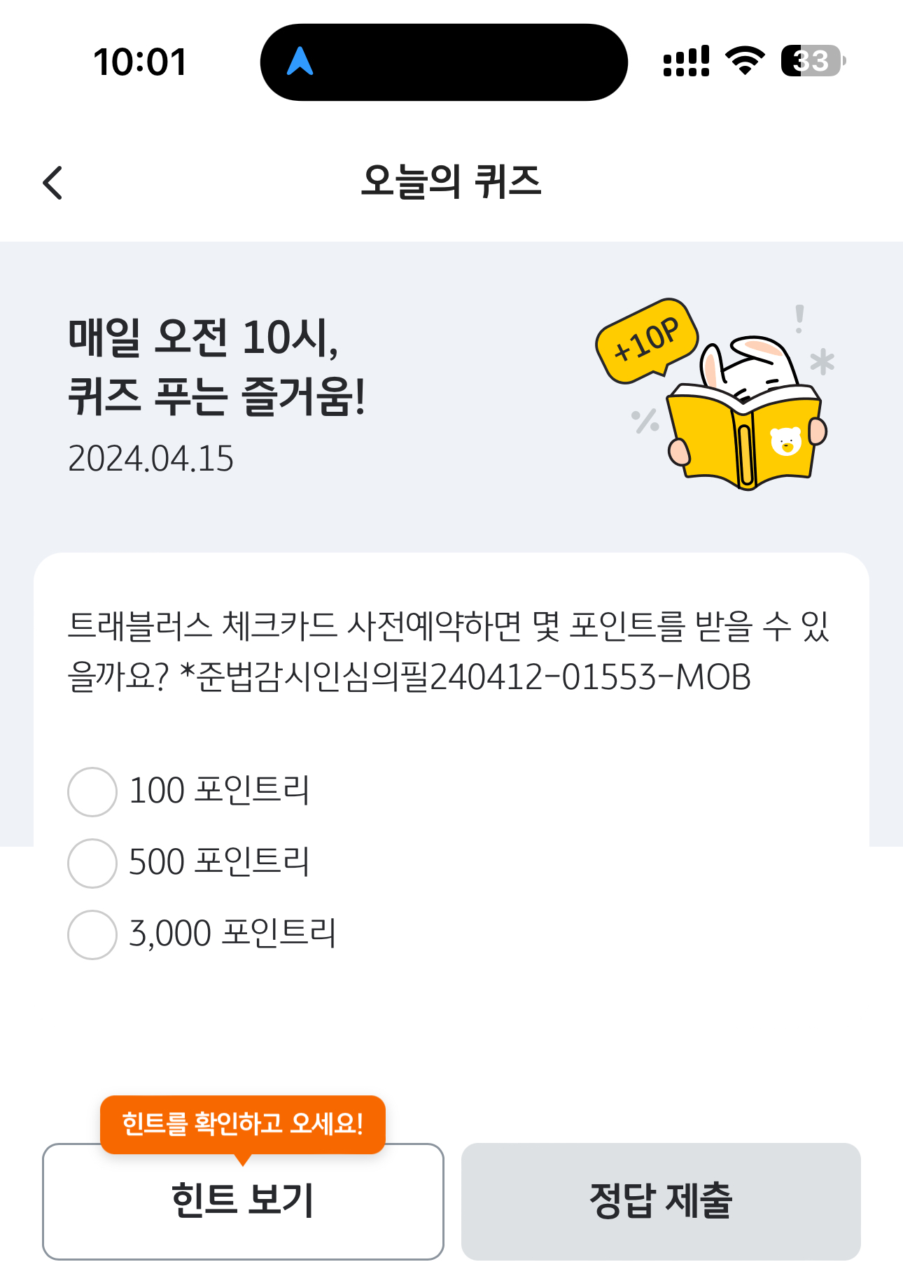 트래블러스 체크카드 사전예약하면 몇 포인트를 받을 수 있을까요? *준법감시인심의필240412-01553-MOB 보기는 1. 100 포인트리 2. 500 포인트리 3. 3,000 포인트리 입니다. 체크카드는 신용카드에 비해 부담 없이 발급 받을 수 있어서 좋죠. 트래블러스 체크카드는 어떤 혜택이 있는지 확인해 보세요