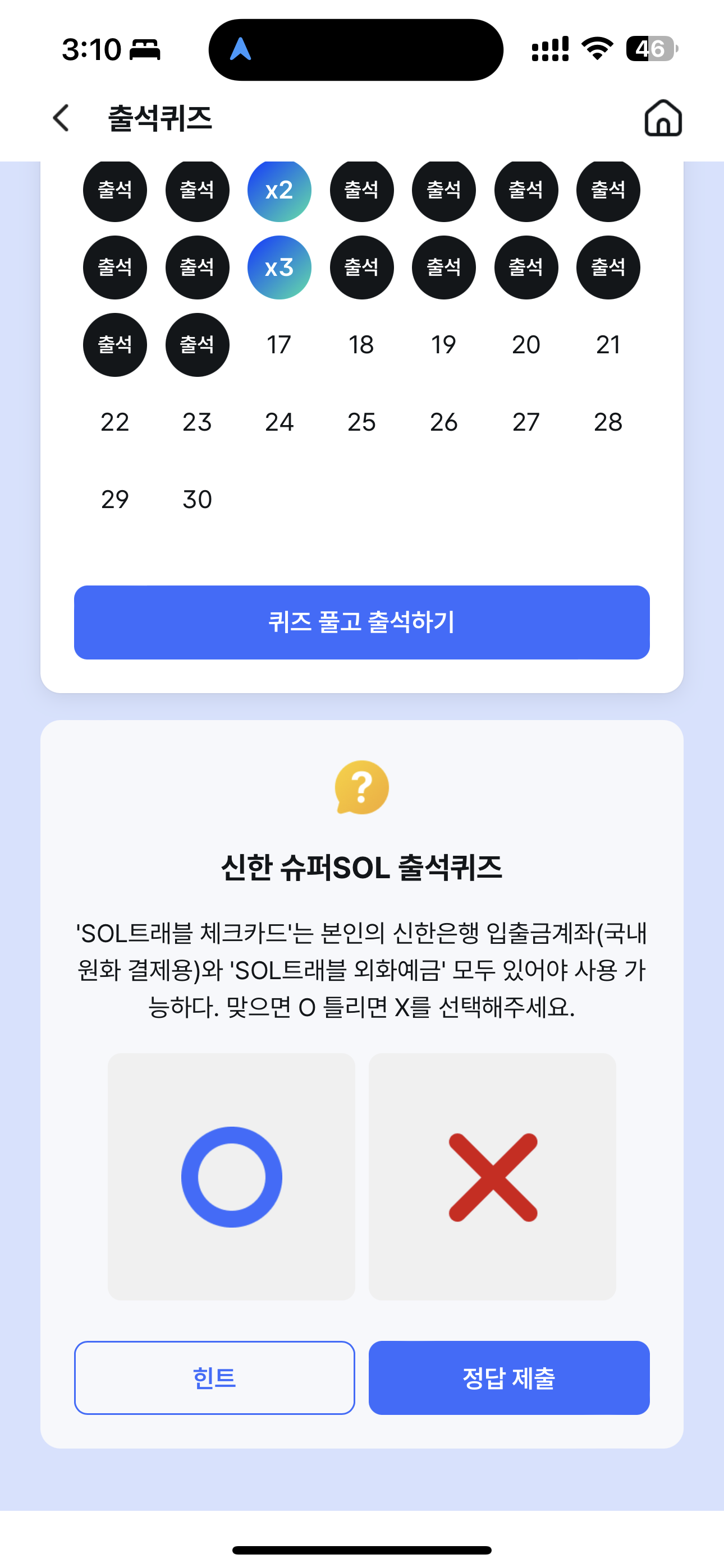 신한 슈퍼SOL 출석퀴즈 정답은 O 입니다