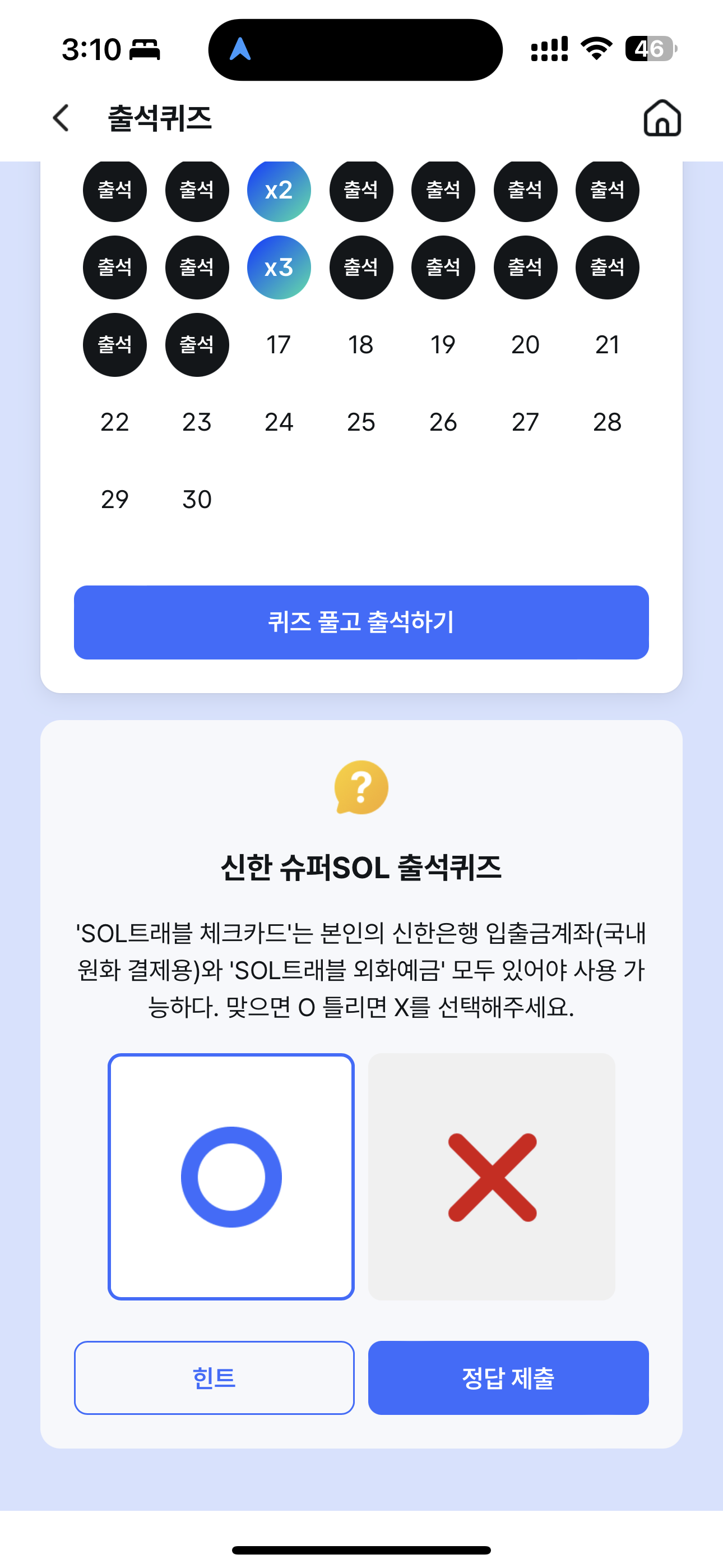신한 슈퍼SOL 출석퀴즈 정답은 O 입니다