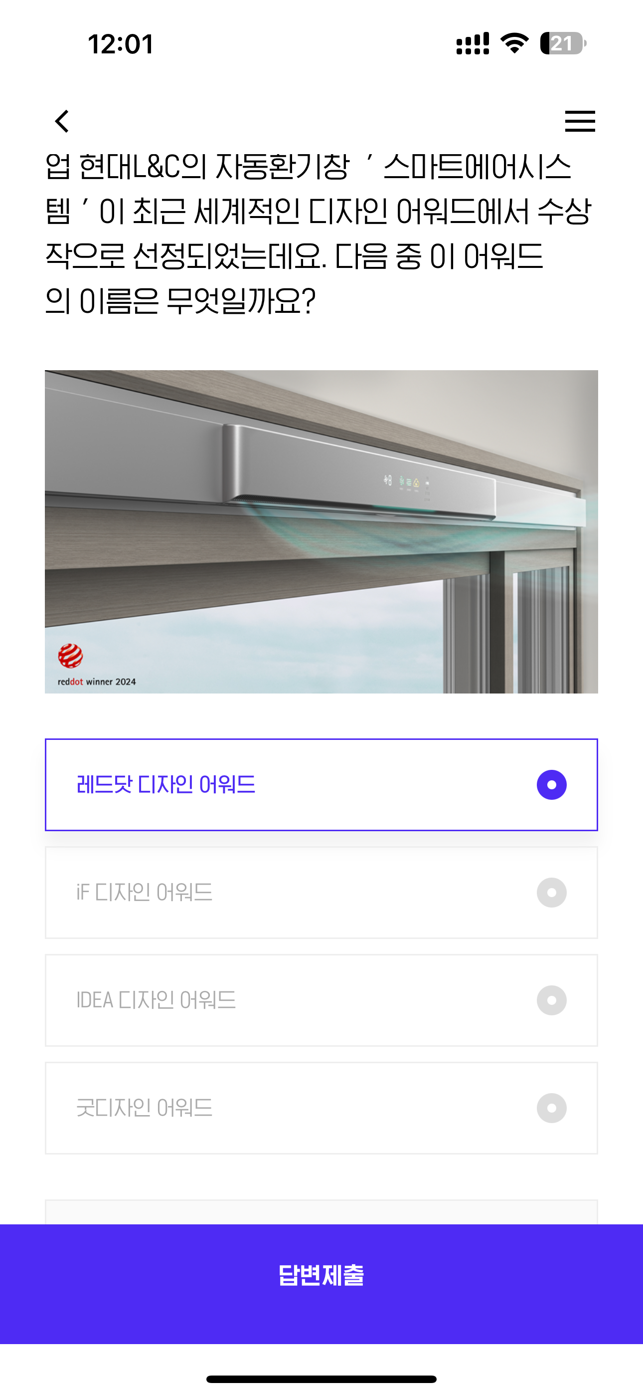 [홍보] 현대백화점그룹 종합 건자재 전문기업 현대L&C의 자동환기창 ' 스마트에어시스템 ' 이 최근 세계적인 디자인 어워드에서 수상작으로 선정되었는데요. 다음 중 이 어워드의 이름은 무엇일까요? 보기는 1. 레드닷 디자인 어워드 2. iF 디자인 어워드 3. IDEA 디자인 어워드 4. 굿디자인 어워드