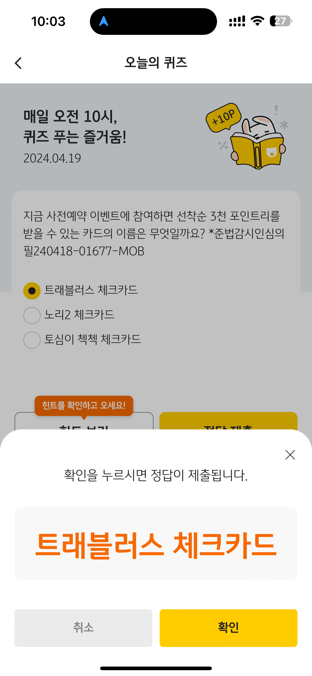 지금 사전예약 이벤트에 참여하면 선착순 3천 포인트리를 받을 수 있는 카드의 이름은 무엇일까요? *준법감시인심의필240418-01677-MOB 보기는 1. 트래블러스 체크카드 2. 노리2 체크카드 3. 토심이 첵첵 체크카드 입니다. 최근 가장 밀고있는 체크카드죠. 지금 시기에 요구되는 체크카드 입니다