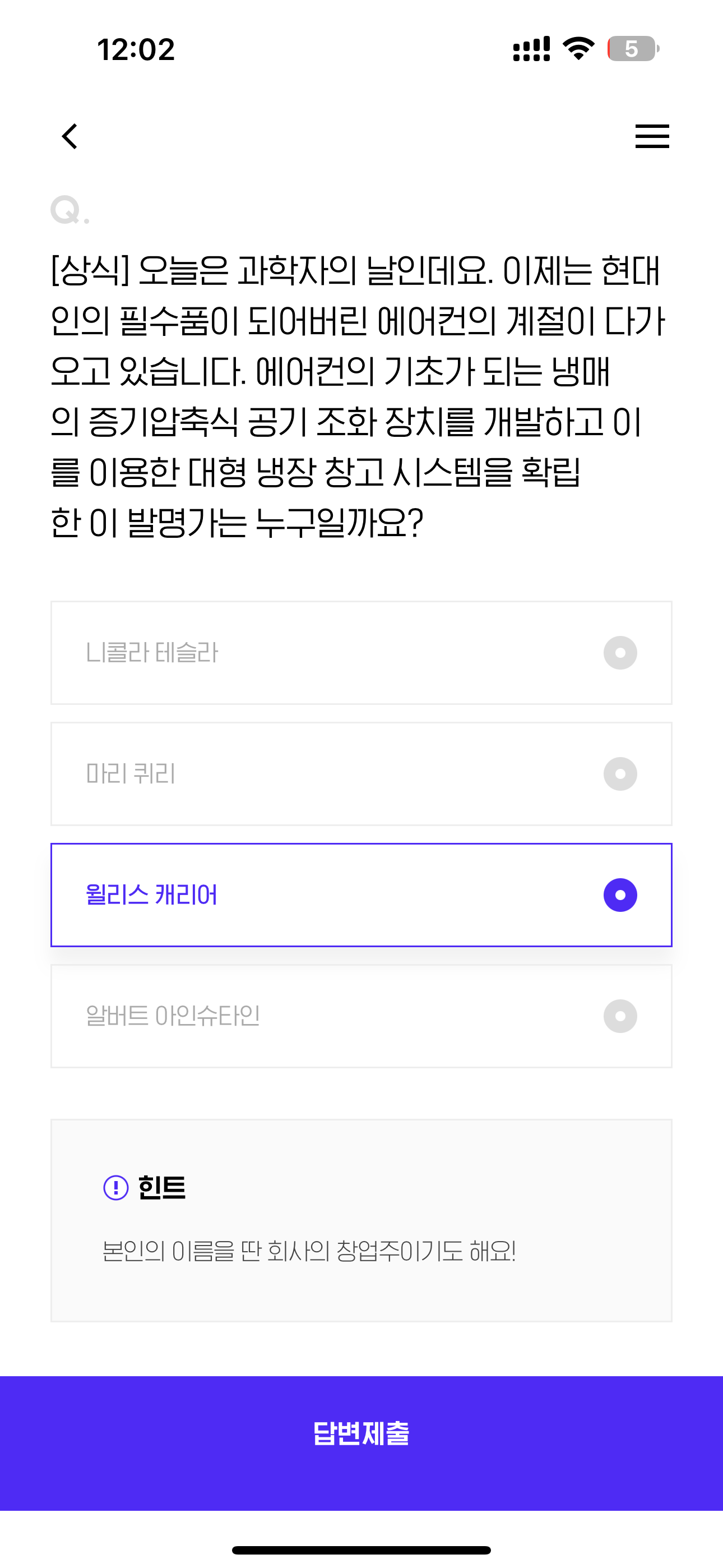 [상식] 오늘은 과학자의 날인데요. 이제는 현대인의 필수품이 되어버린 에어컨의 계절이 다가오고 있습니다. 에어컨의 기초가 되는 냉매의 증기압축식 공기 조화 장치를 개발하고 이를 이용한 대형 냉장 창고 시스템을 확립한 이 발명가는 누구일까요? 보기는 1. 니콜라 테슬라 2. 마리 퀴리 3. 윌리스 캐리어 4. 알버트 아인슈타인 입니다