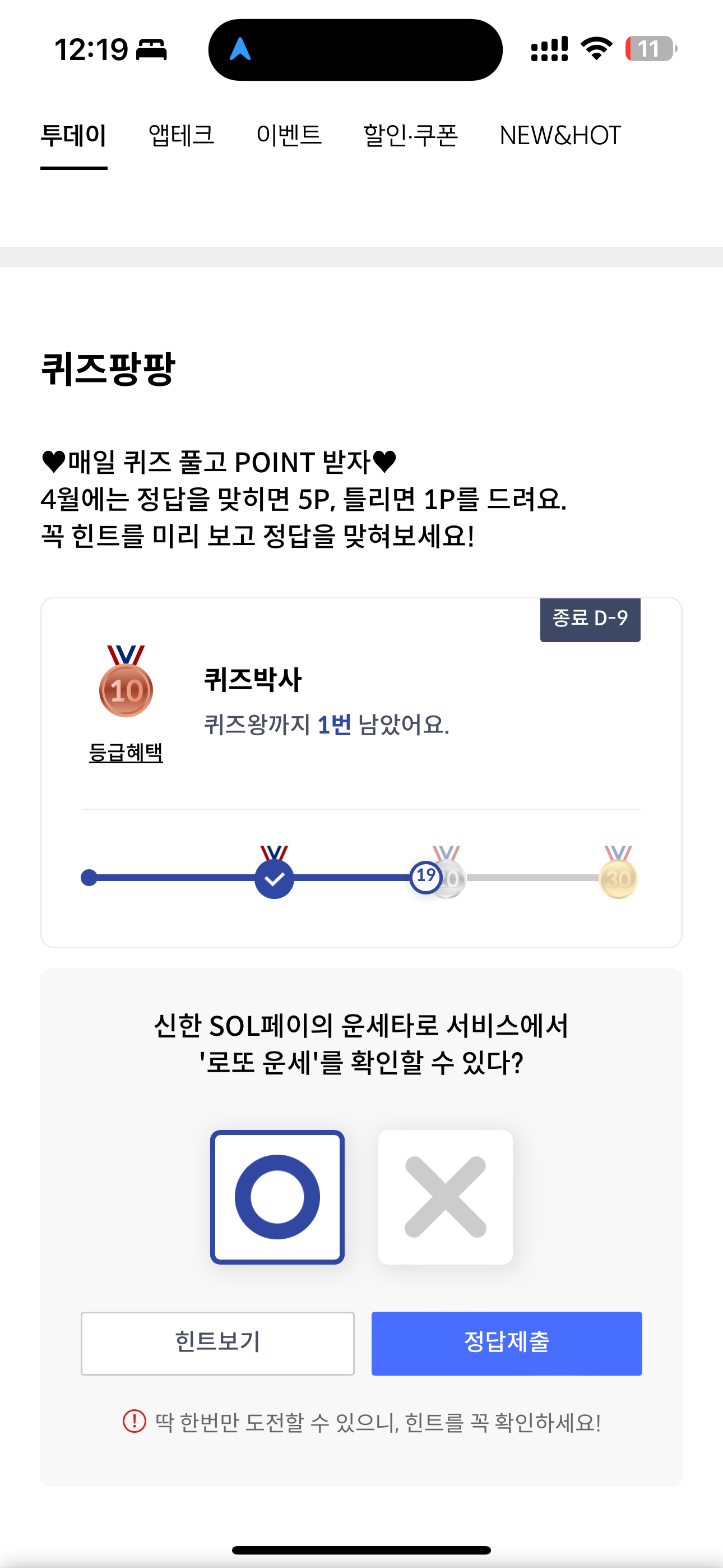 신한카드 퀴즈팡팡 정답은 O 입니다