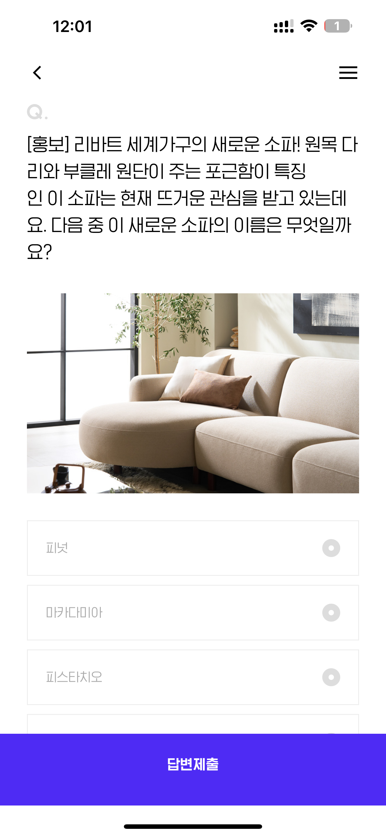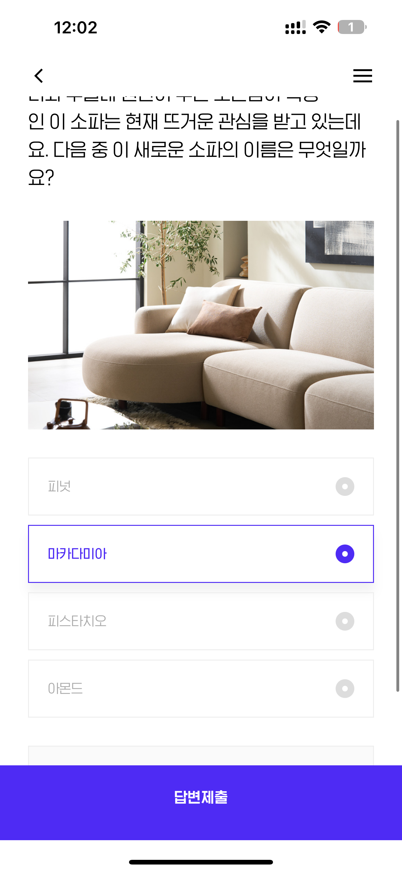 [홍보] 리바트 세계가구의 새로운 소파! 원목 다리와 부클레 원단이 주는 포근함이 특징인 이 소파는 현재 뜨거운 관심을 받고 있는데요. 다음 중 이 새로운 소파의 이름은 무엇일까요? 보기는 1. 피넛 2. 마카다미아 3. 피스타치오 4. 아몬드 입니다. 다 초콜릿과 잘 어울리는 매칭인데 과연 뭘까요?
