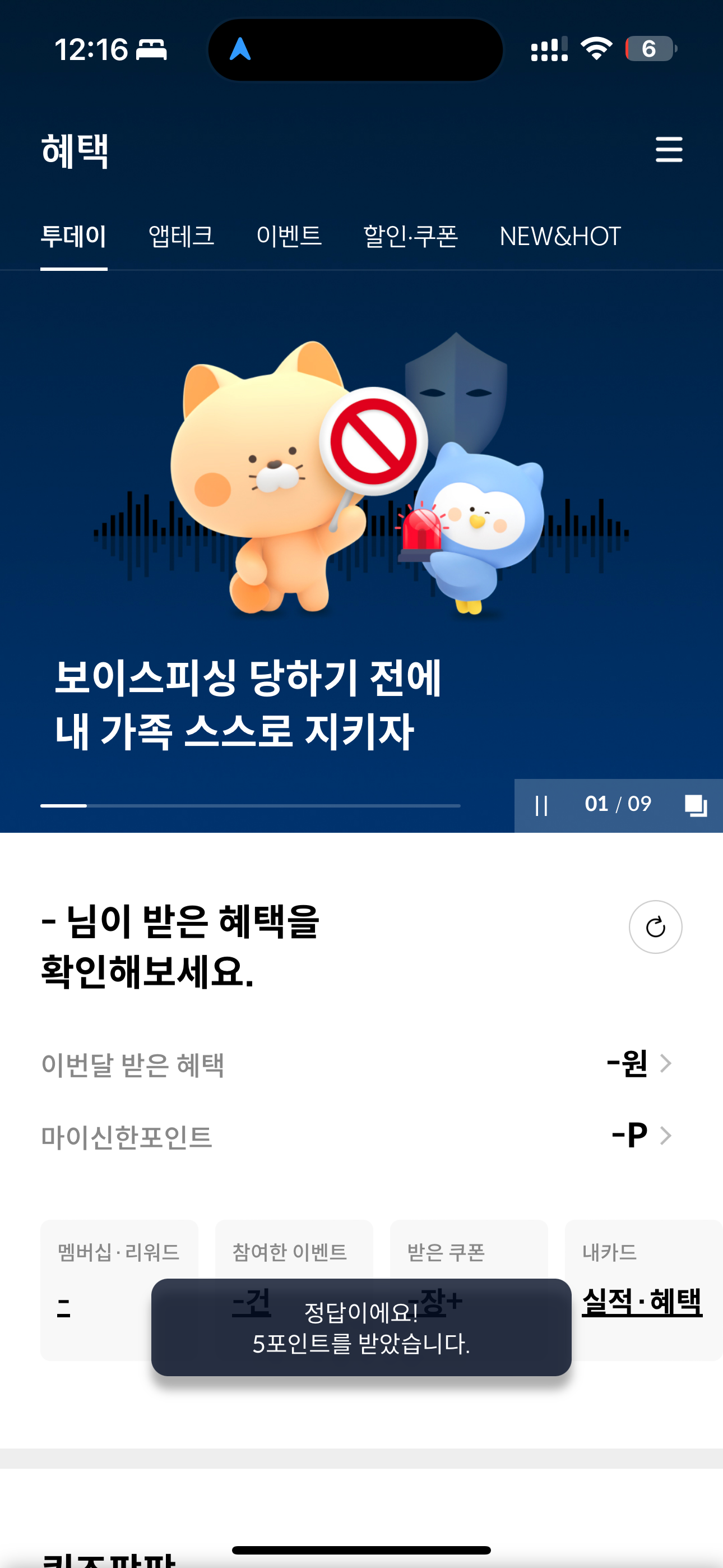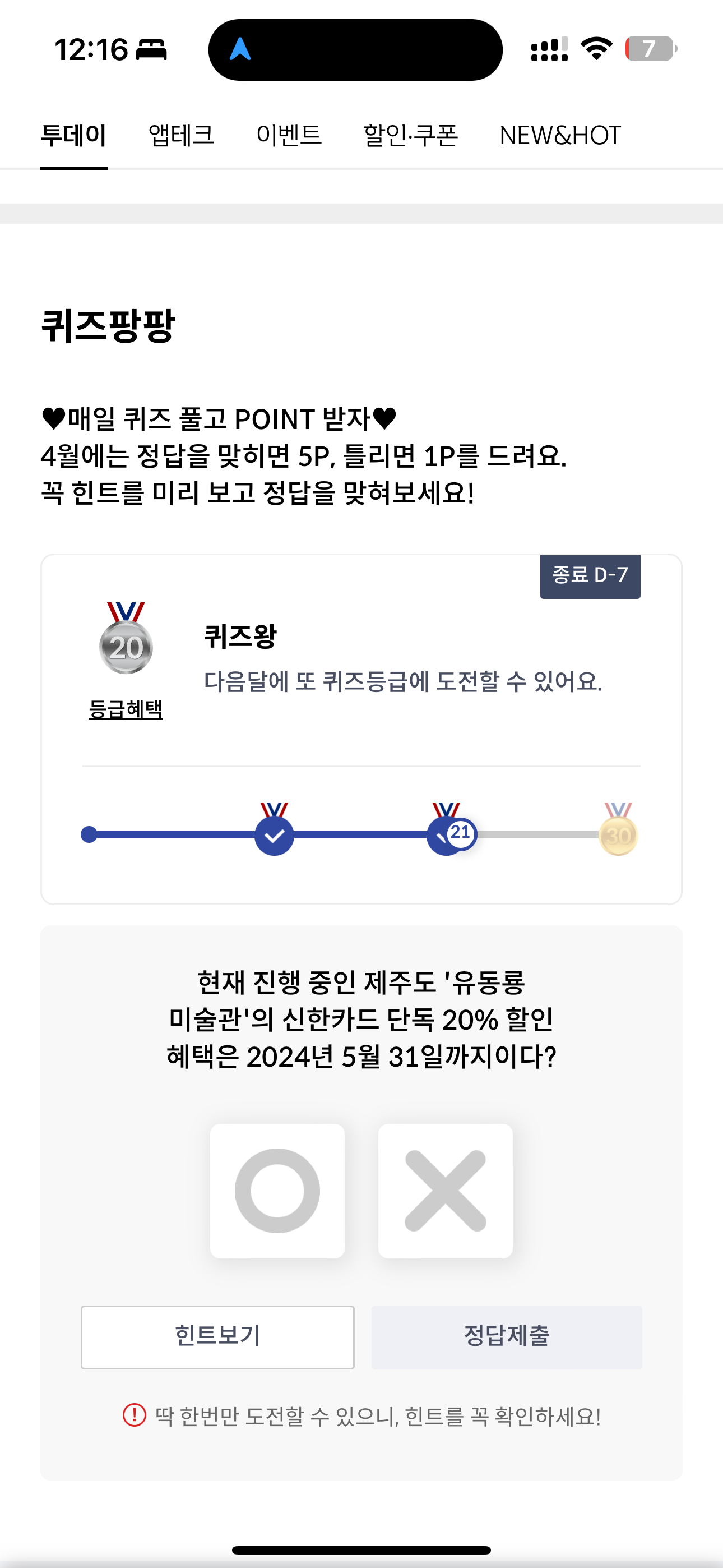 신한카드 퀴즈팡팡 정답은 O 입니다