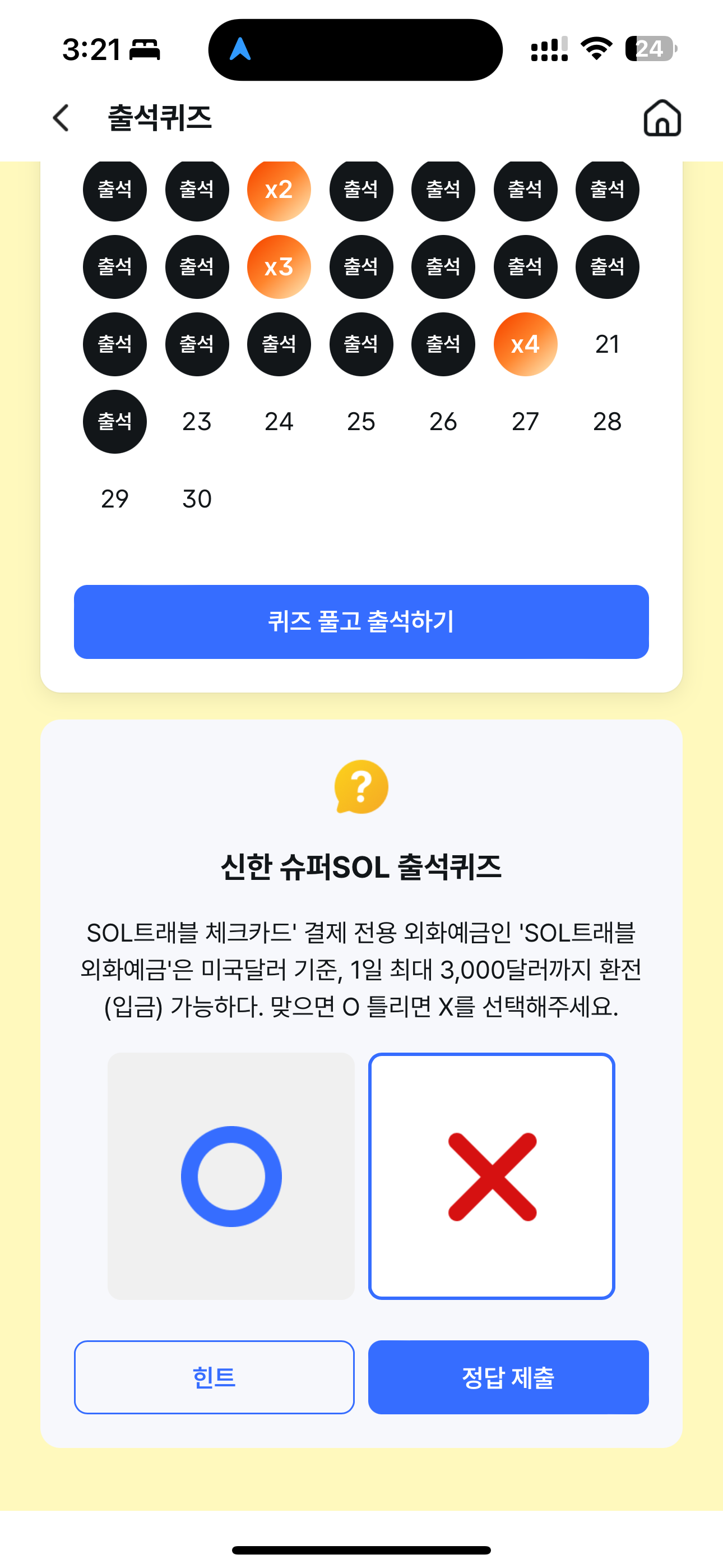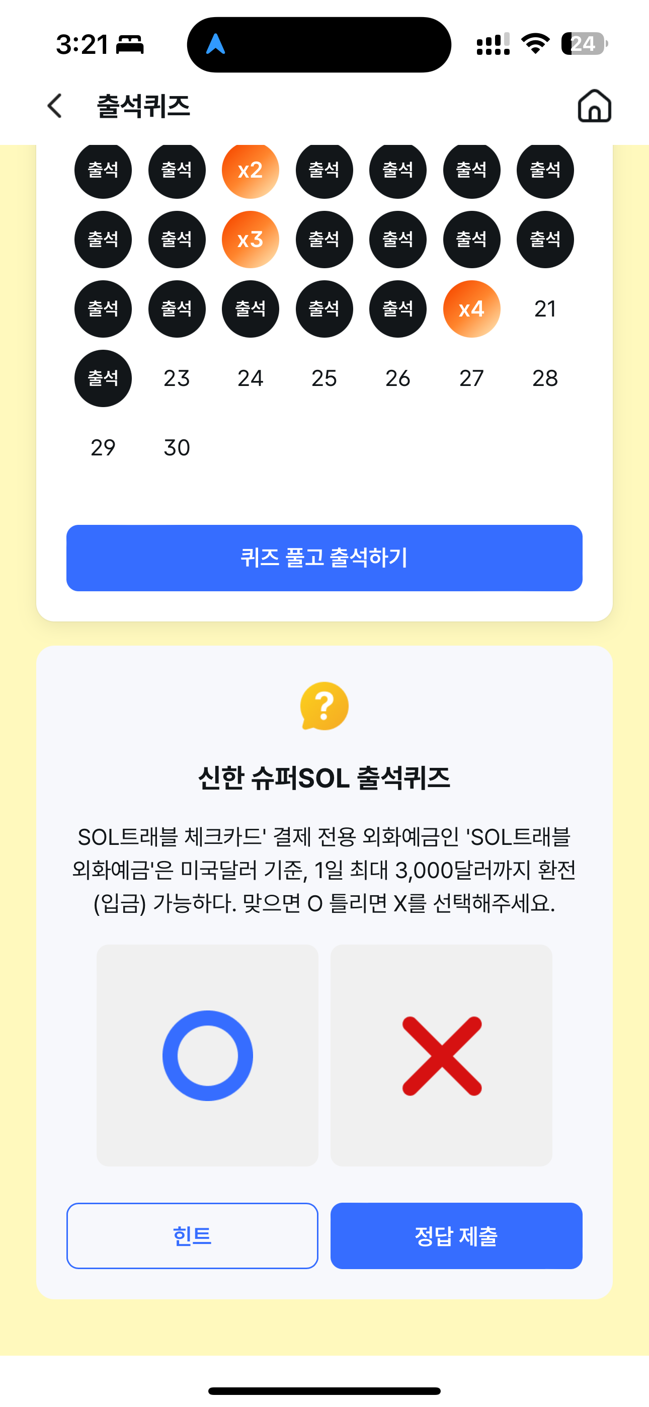 신한 슈퍼SOL 출석퀴즈 정답은 X 입니다