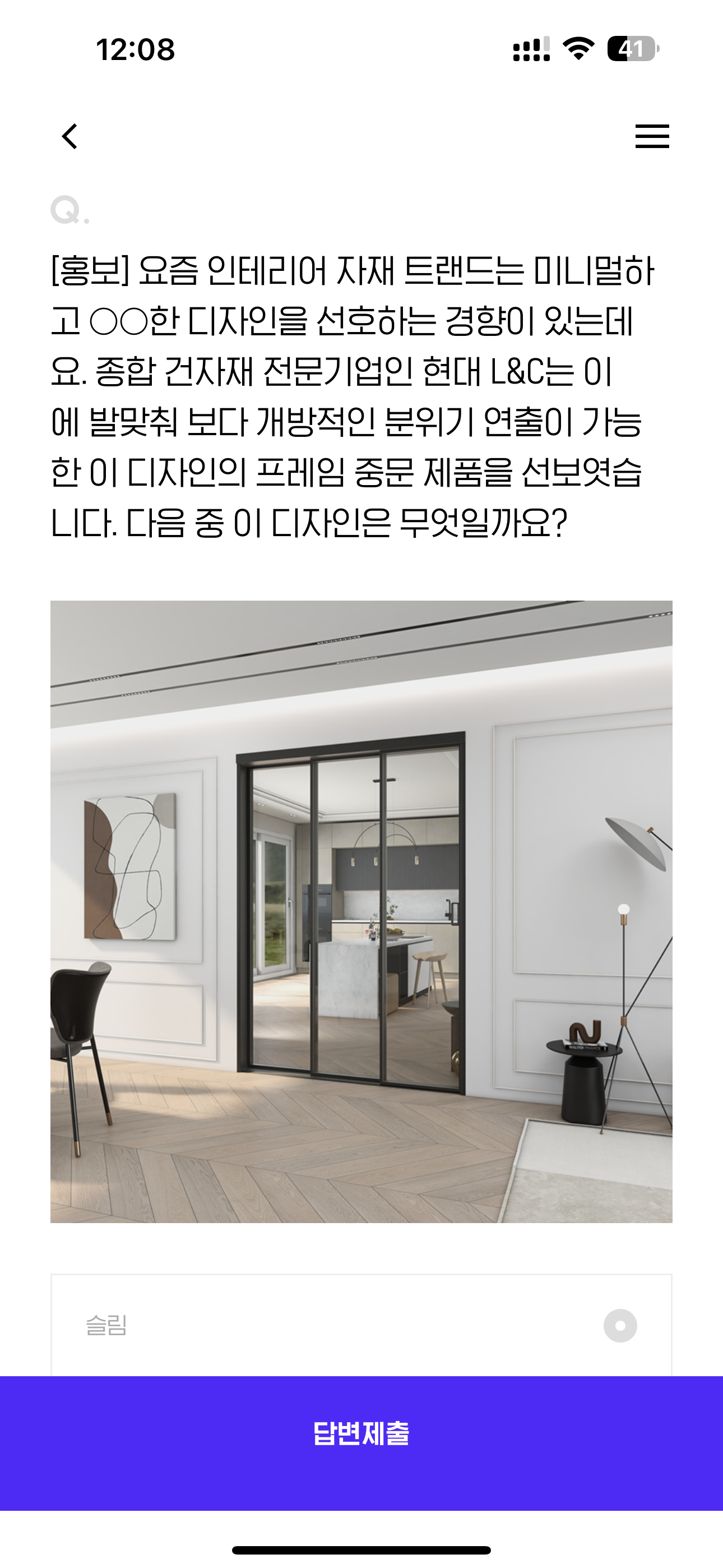 [홍보] 요즘 인테리어 자재 트랜드는 미니멀하고 OO한 디자인을 선호하는 경향이 있는데요. 종합 건자재 전문기업인 현대 L&C는 이에 발맞춰 보다 개방적인 분위기 연출이 가능한 이 디자인의 프레임 중문 제품을 선보였습니다. 다음 중 이 디자인은 무엇일까요? 보기는 1. 슬림 2. 노블 3. 레어 4. 클린 입니다