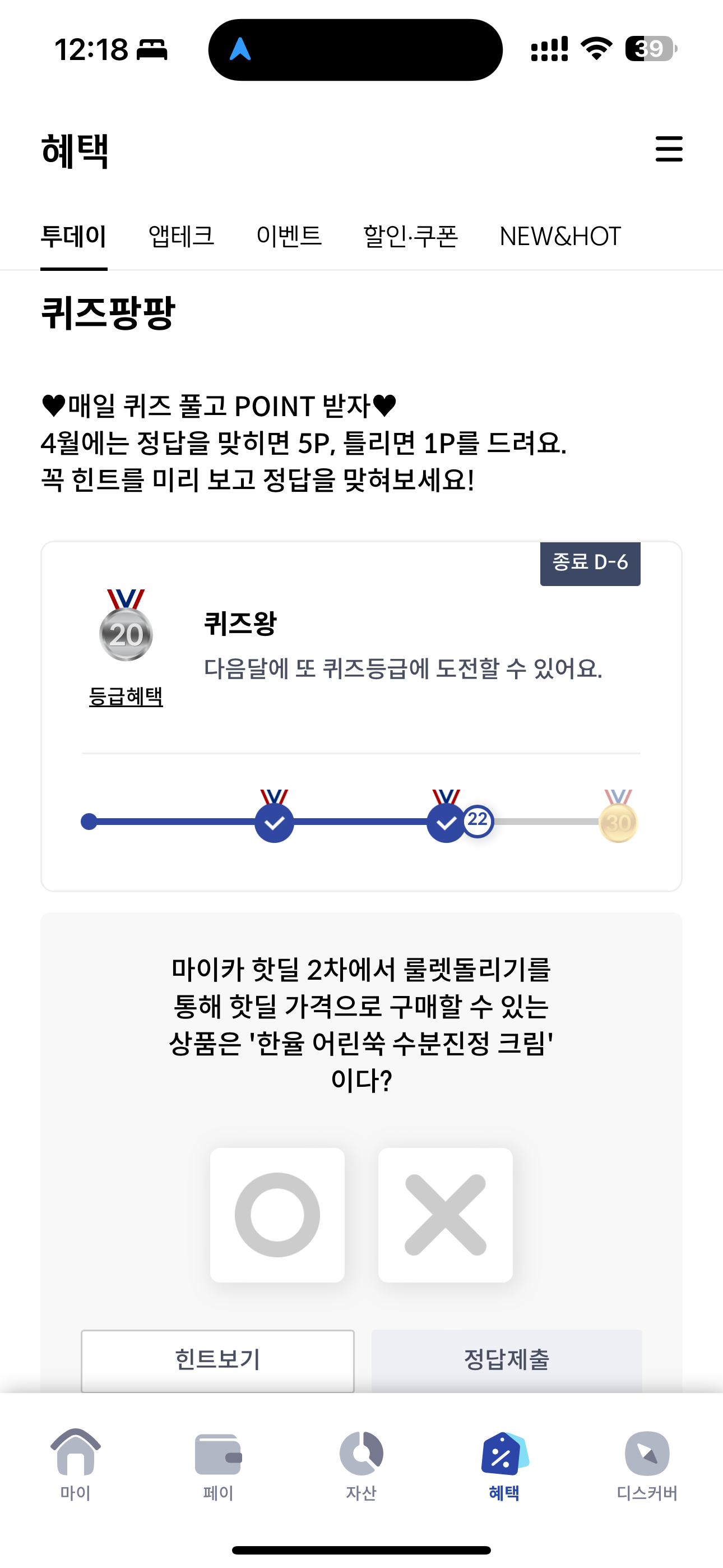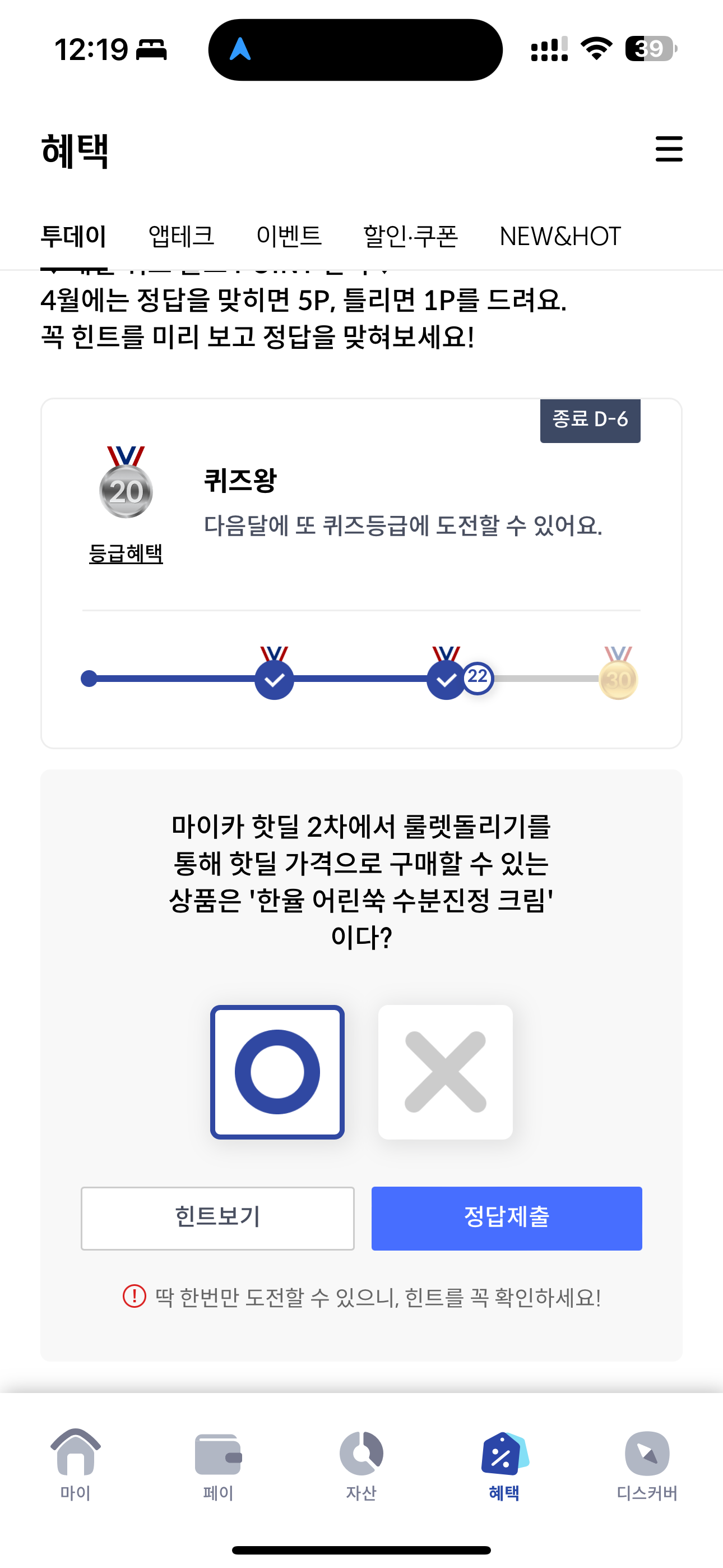 마이카 핫딜 2차에서 룰렛돌리기를 통해 핫딜 가격으로 구매할 수 있는 상품은 '한율 어린쑥 수분진정 크림'이다? O, X 퀴즈인데요. 마이카에서 핫딜로 좋은 가격에 구입할 수 있게 다양한 상품들이 준비되어 있습니다. 자신에게 필요한 제품이 있는지 확인해 보세요