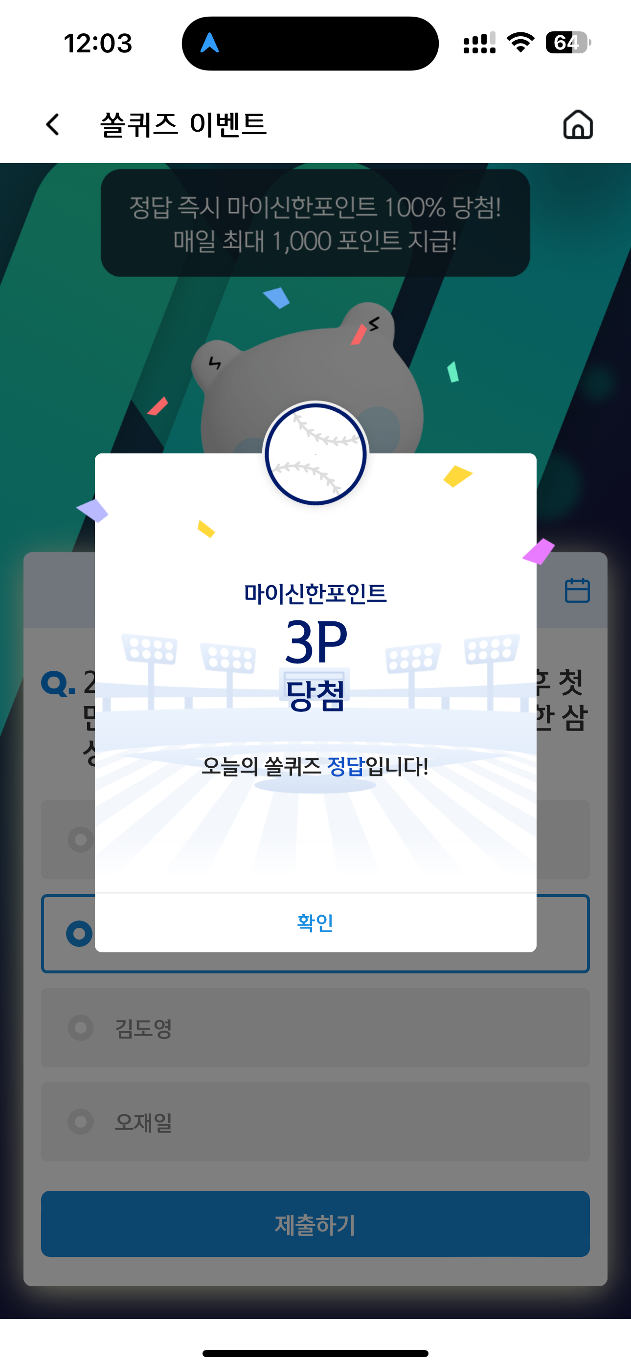 신한 슈퍼SOL 야구/상식 쏠퀴즈 정답은 이성규 입니다