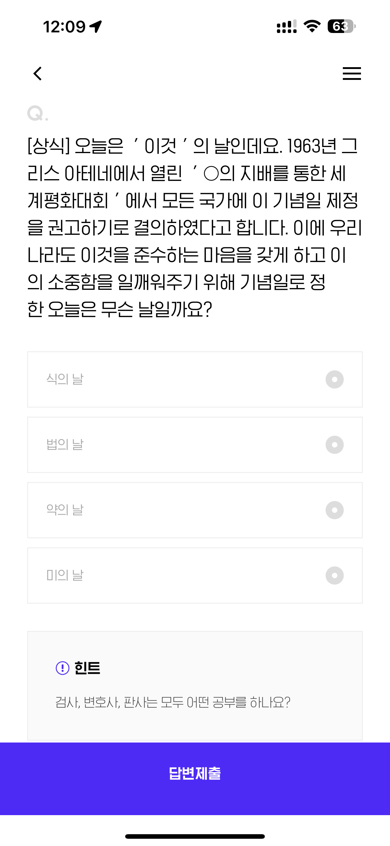 [상식] 오늘은 ' 이것 ' 의 날인데요. 1963년 그리스 아테네에서 열린 ' O의 지배를 통한 세계평화대회 ' 에서 모든 국가에 이 기념일 제정을 권고하기로 결의하였다고 합니다. 이에 우리나라도 이것을 준수하는 마음을 갖게 하고 이의 소중함을 일깨워주기 위해 기념일로 정한 오늘은 무슨 날일까요? 보기는 1. 식의 날 2. 법의 날 3. 약의 날 4. 미의 날 입니다
