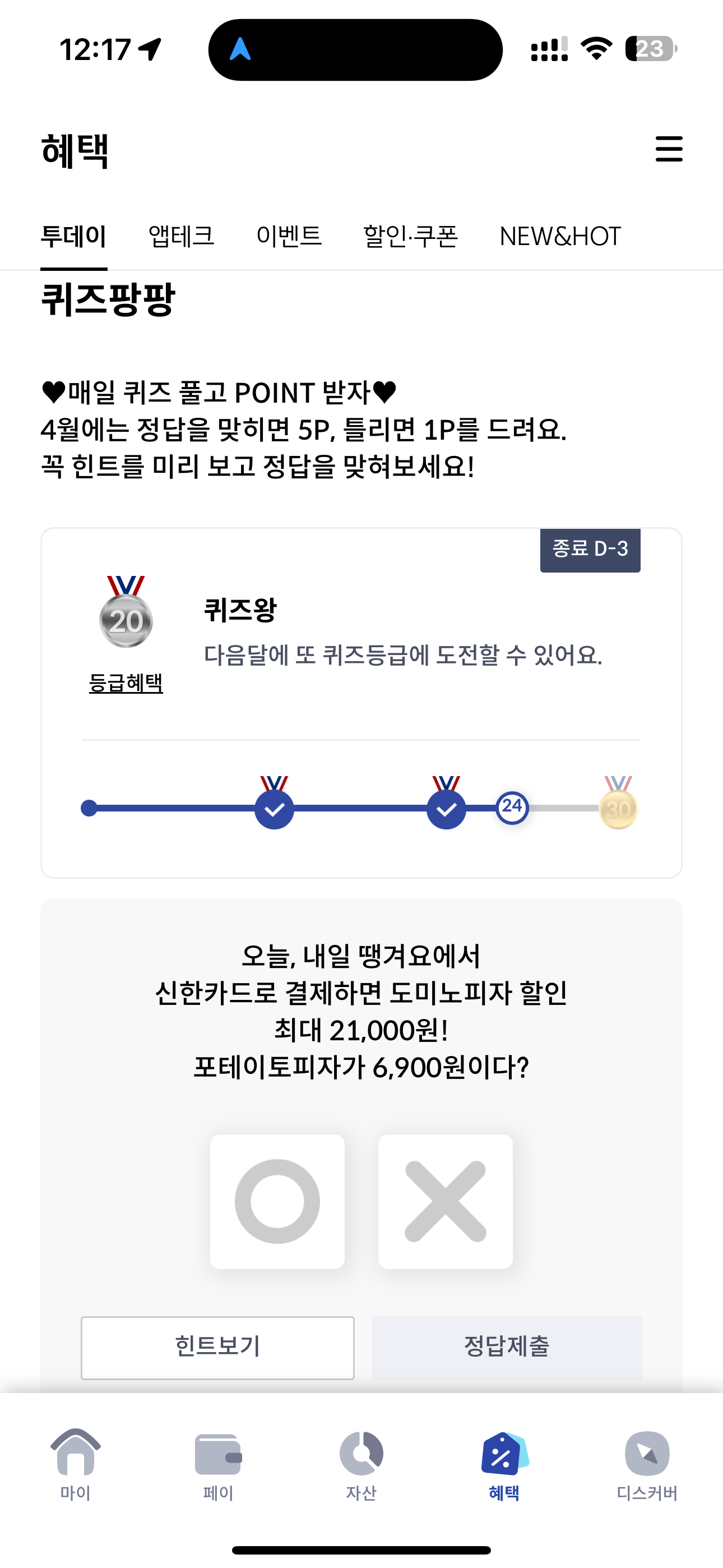 신한카드 퀴즈팡팡 정답은 O 입니다