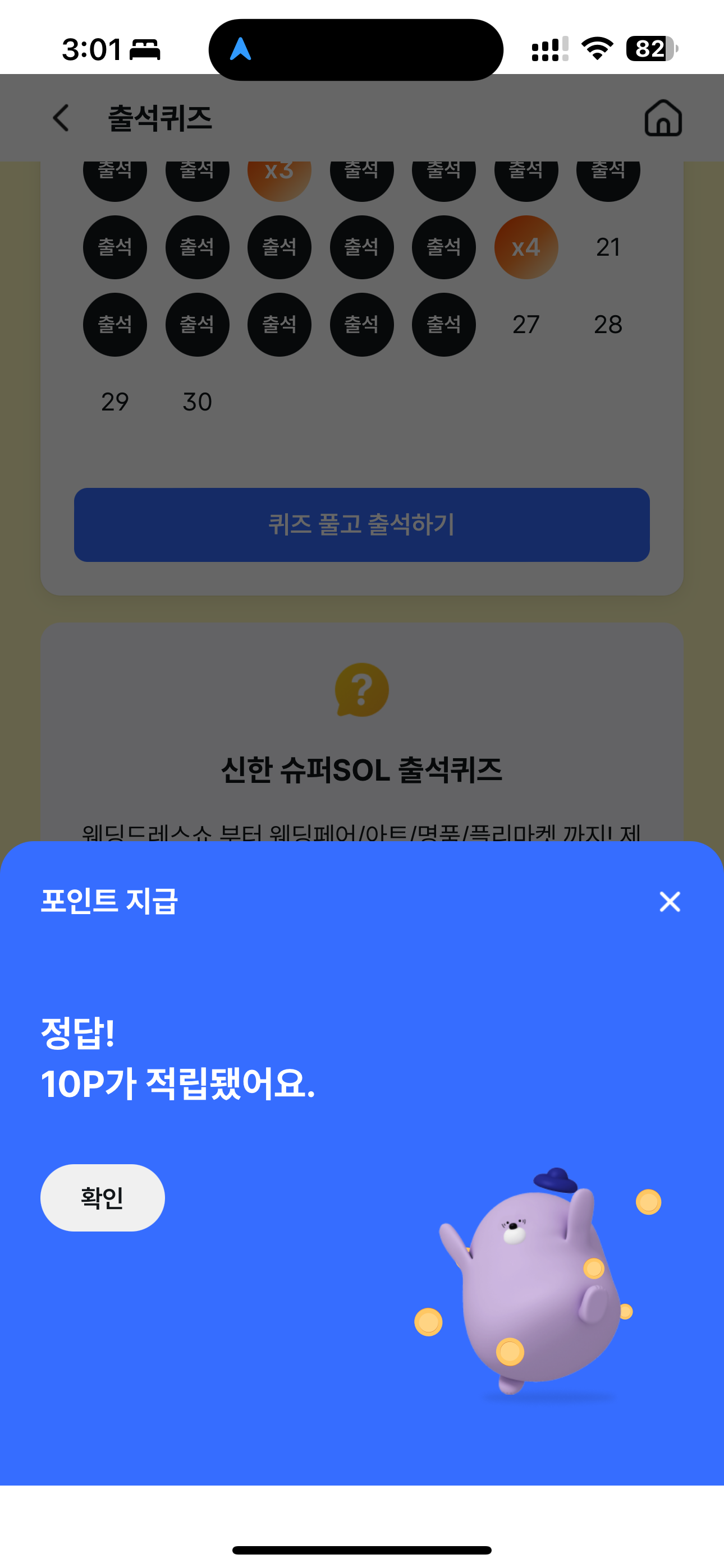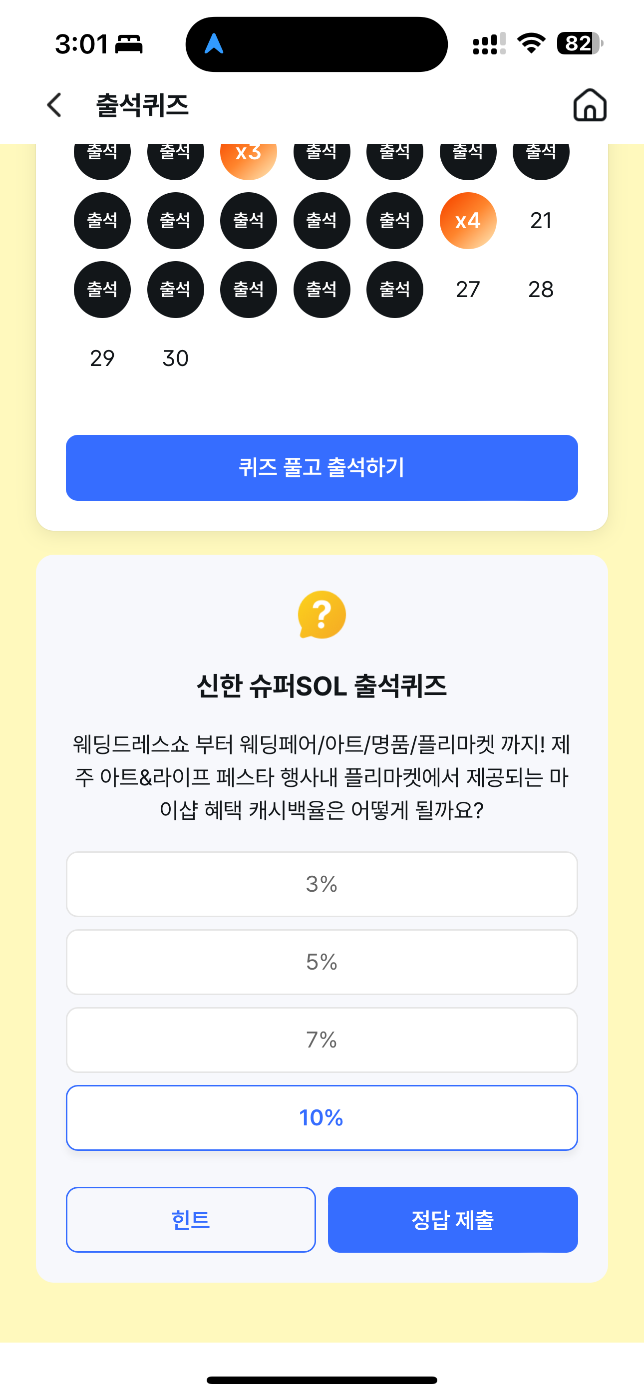 신한 슈퍼SOL 출석퀴즈 정답은 10% 입니다