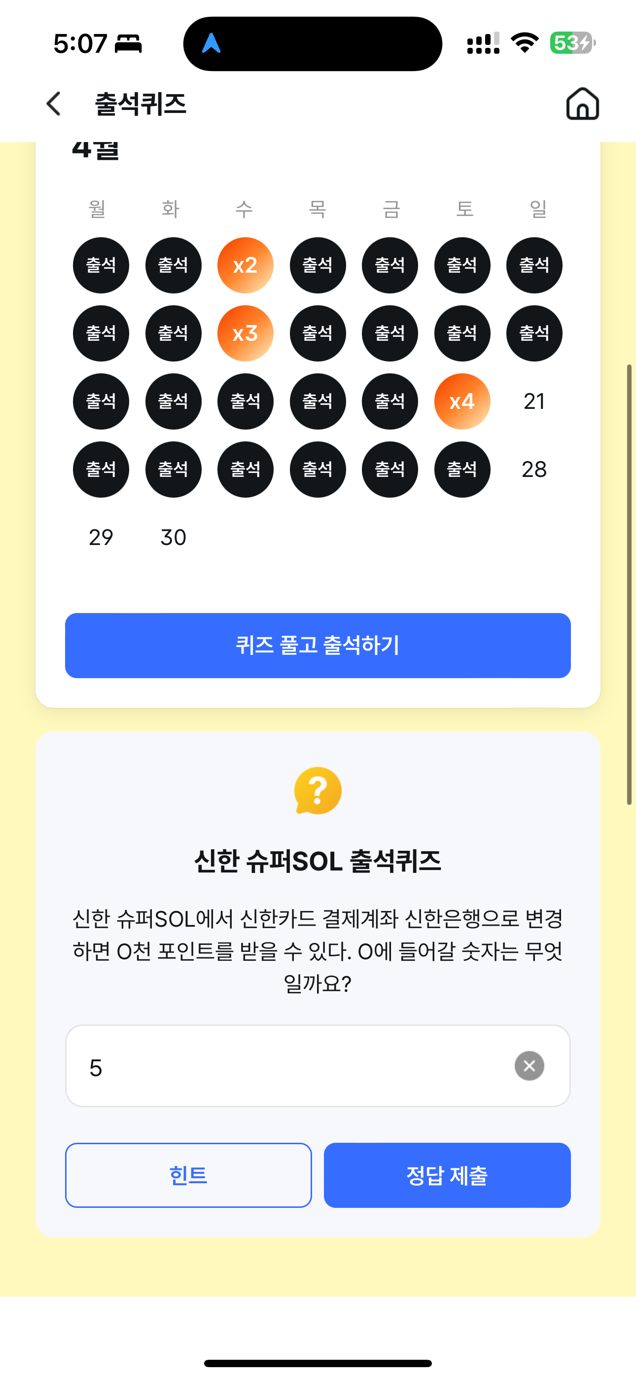 신한 슈퍼SOL 출석퀴즈 정답은 5 입니다