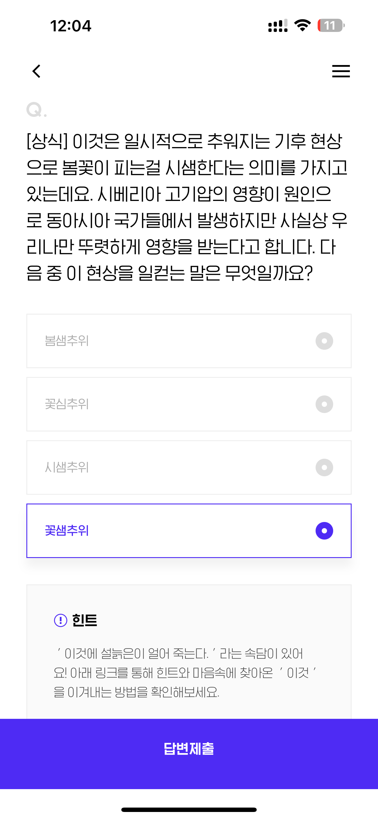 H포인트 퀴즈 정답은 꽃샘추위 입니다
