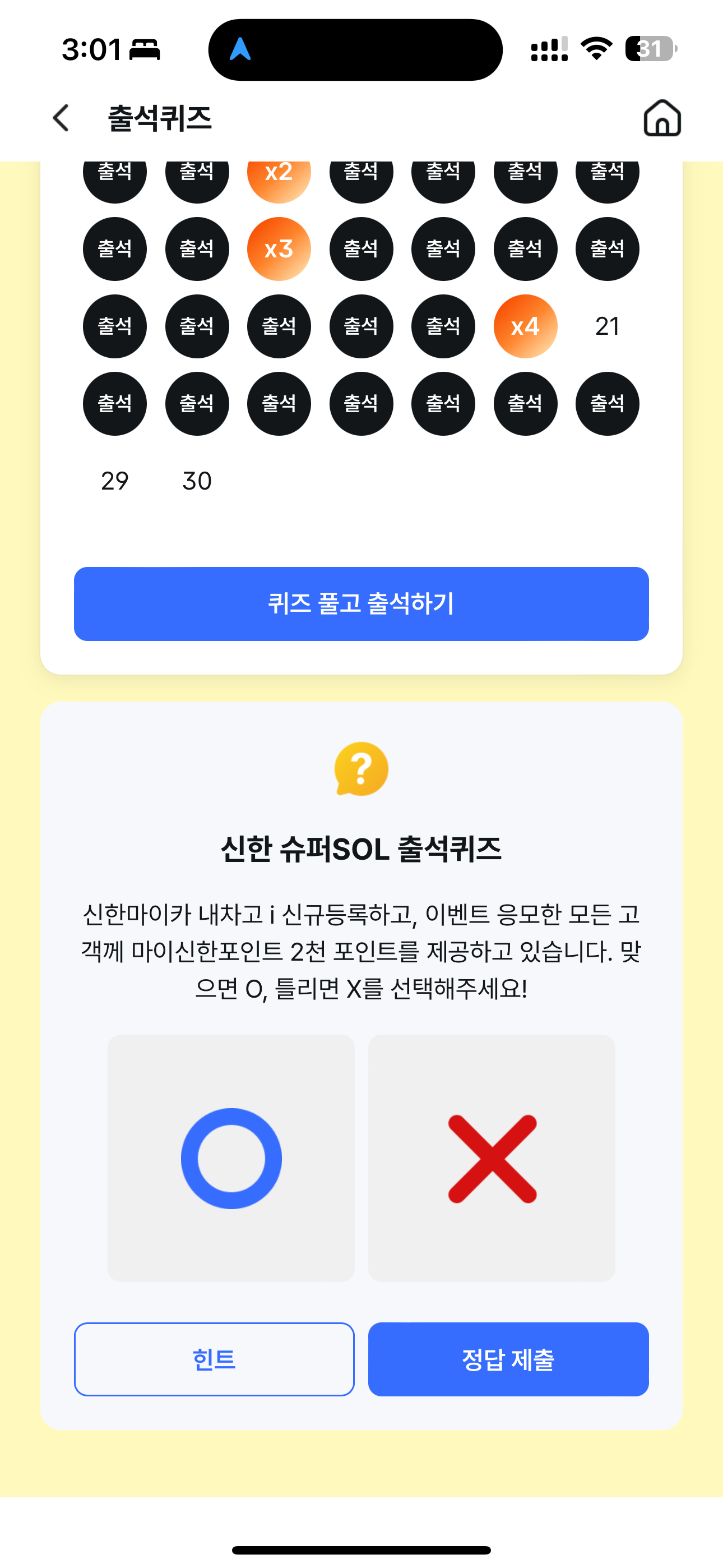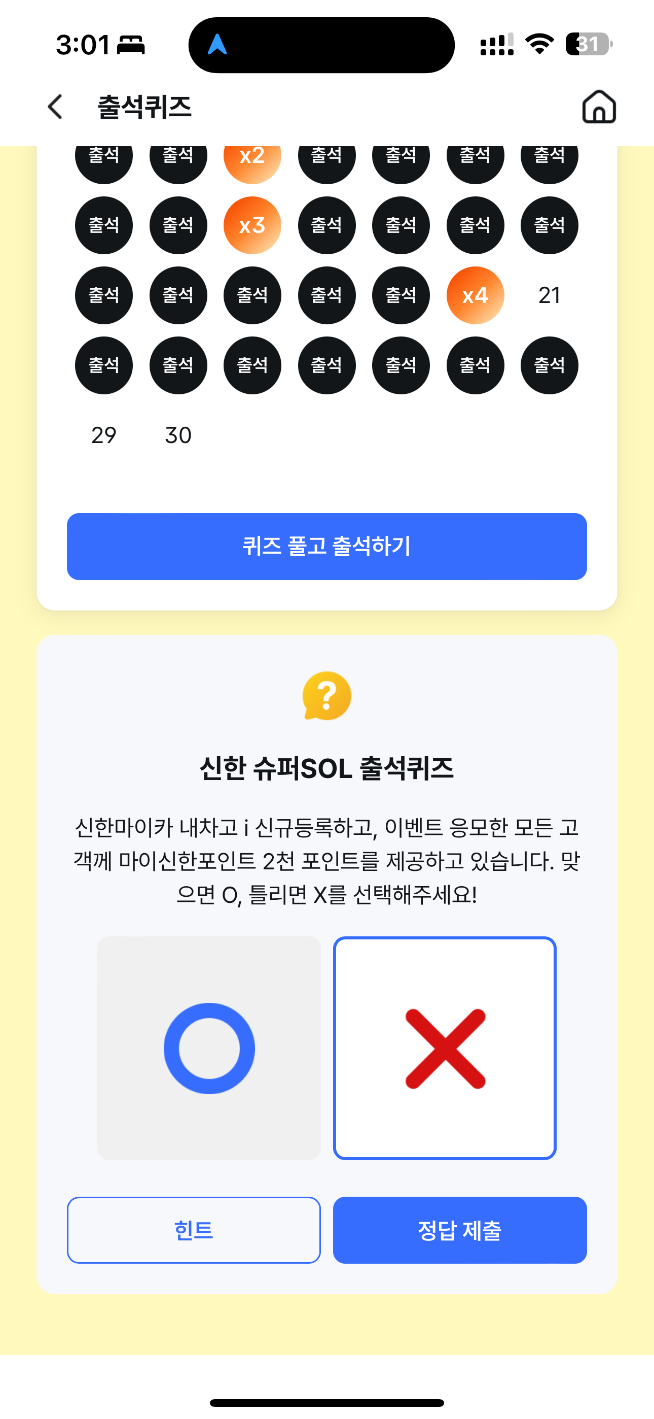 신한 슈퍼SOL 출석퀴즈 정답은 X 입니다