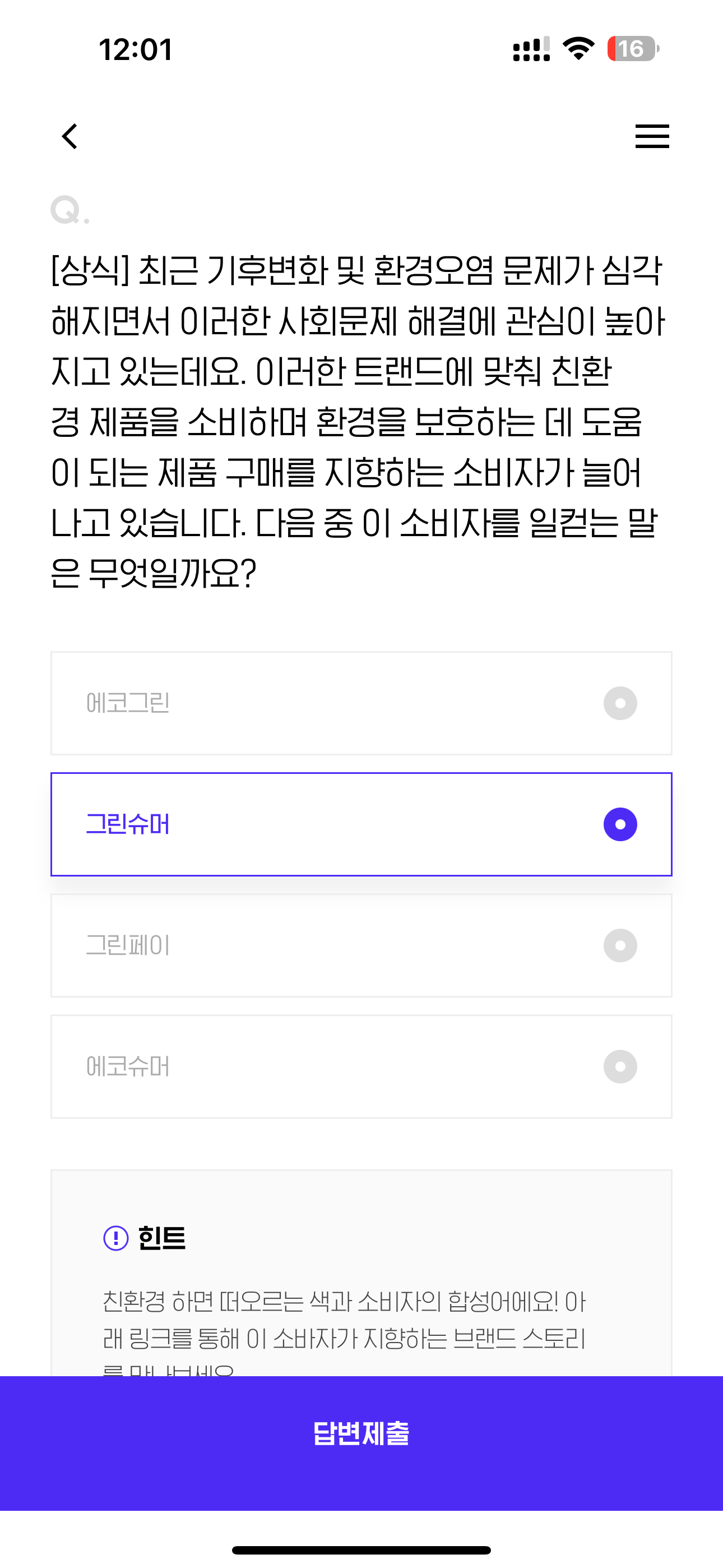 H포인트 퀴즈 정답은 그린슈머 입니다