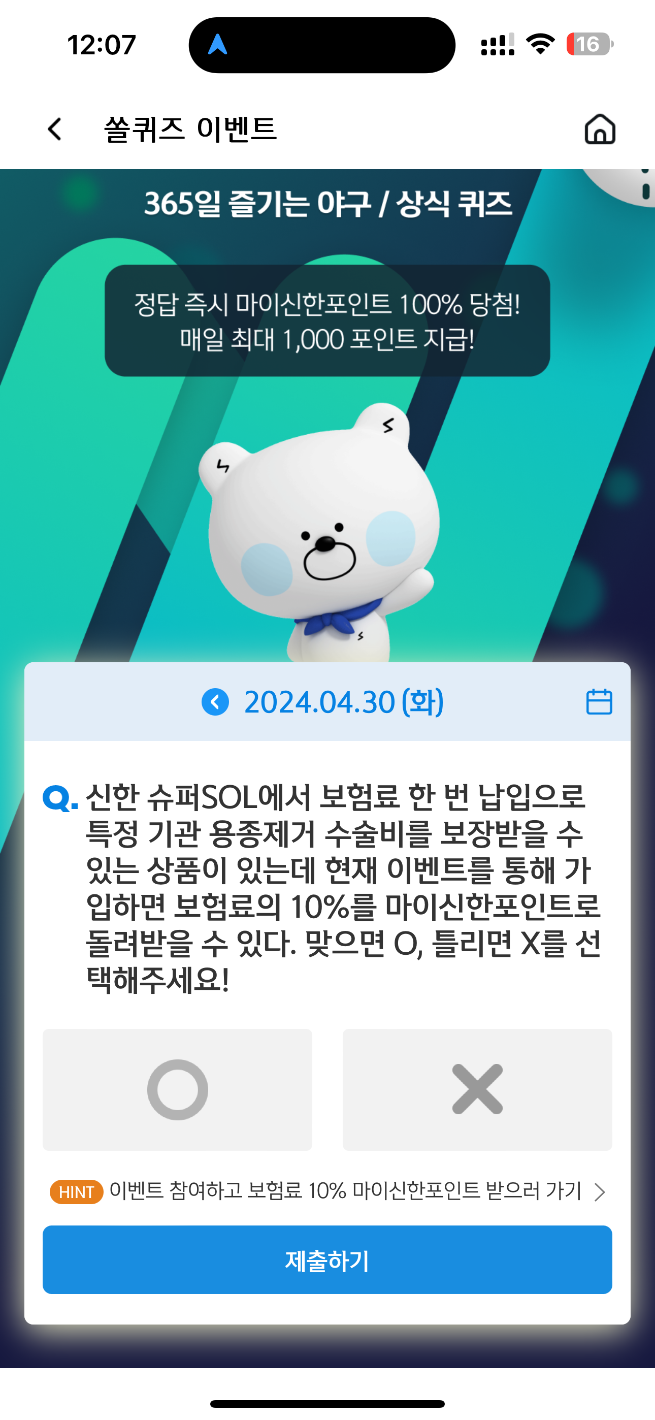 신한 슈퍼SOL에서 보험료 한 번 납입으로 특정 기관 용종제거 수술비를 보장받을 수 있는 상품이 있는데 현재 이벤트를 통해 가입하면 보험료의 10%를 마이신한포인트로 돌려받을 수 있다. 맞으면 O, 틀리면 X를 선택해주세요! O, X 퀴즈인데요. 힌트에 보면 답이 보입니다.