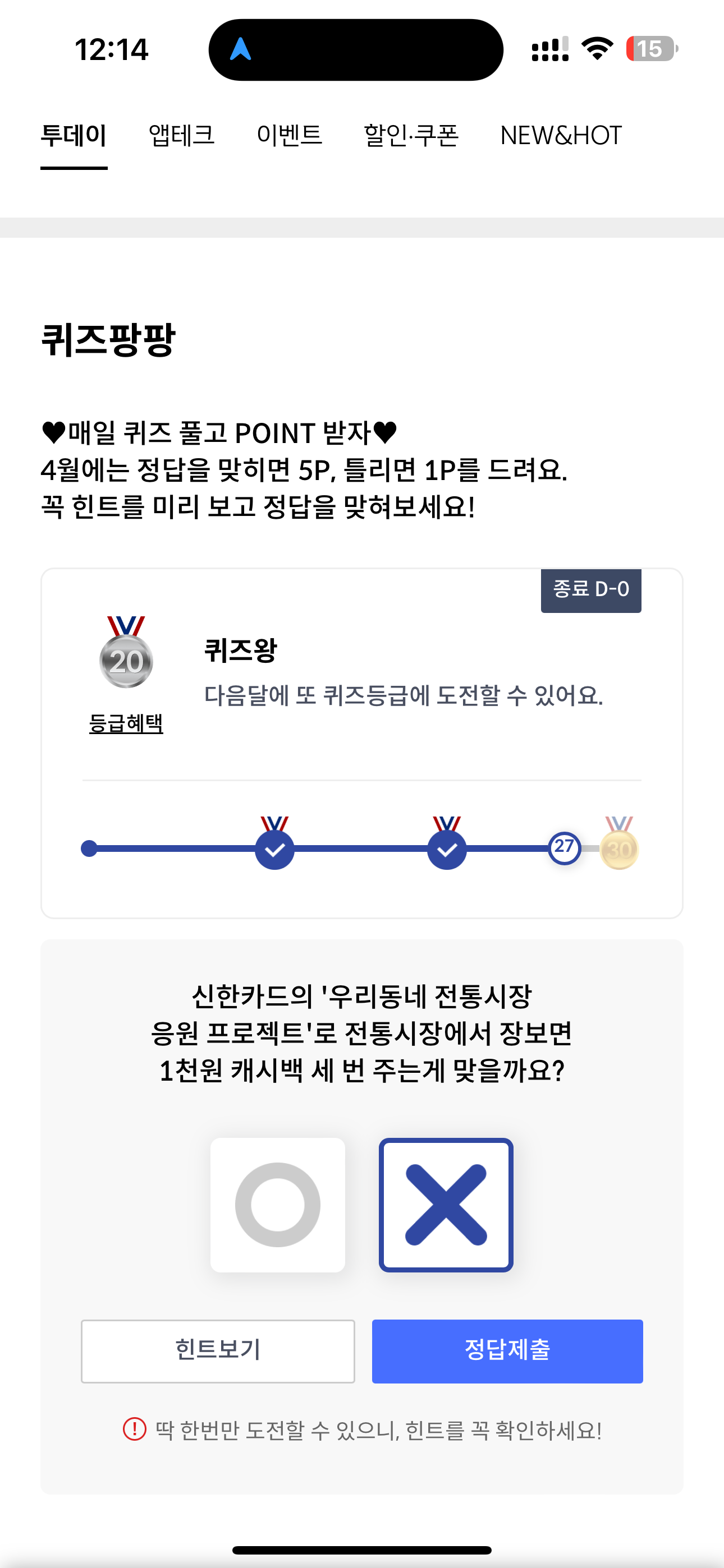 신한카드 퀴즈팡팡 정답은 X 입니다