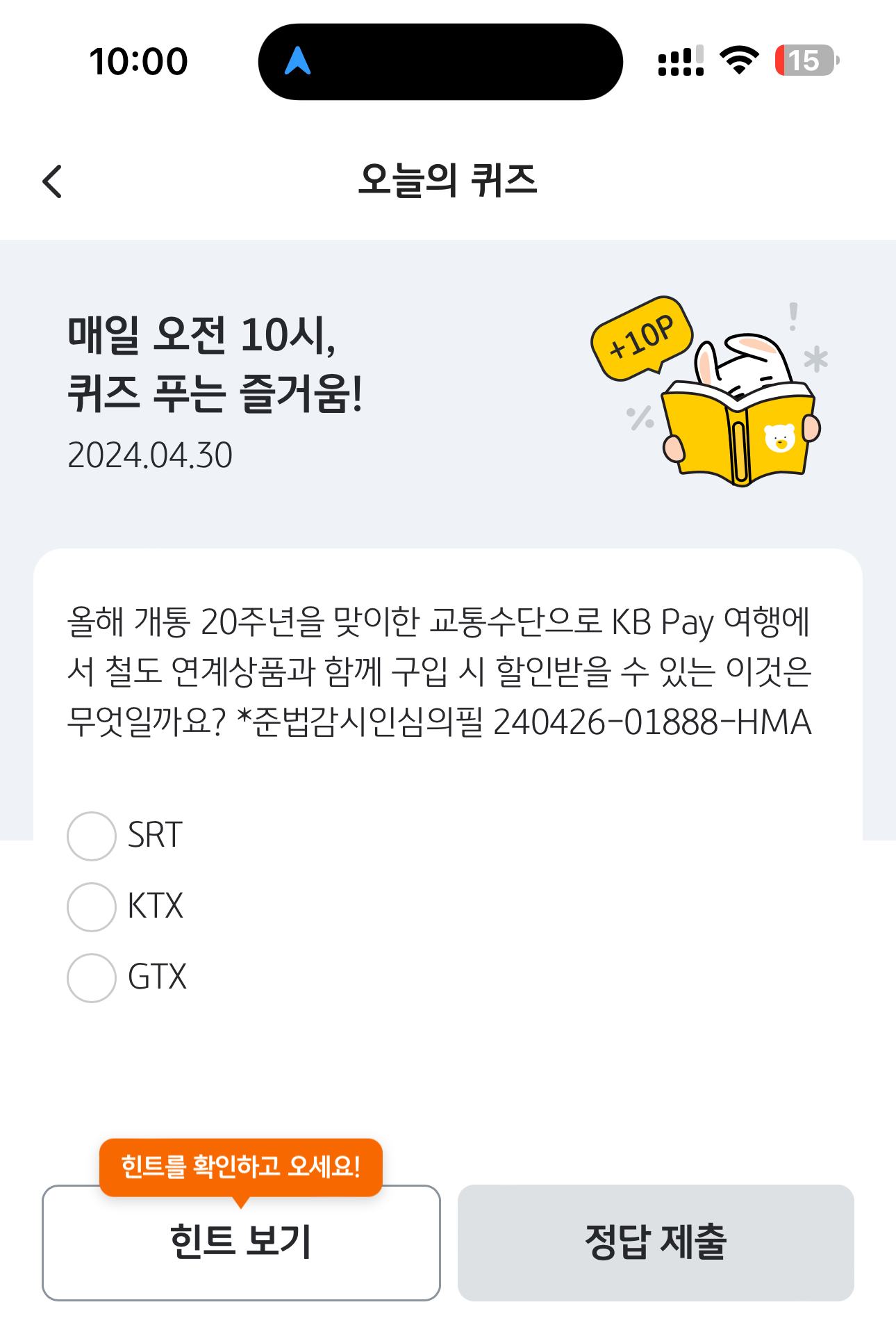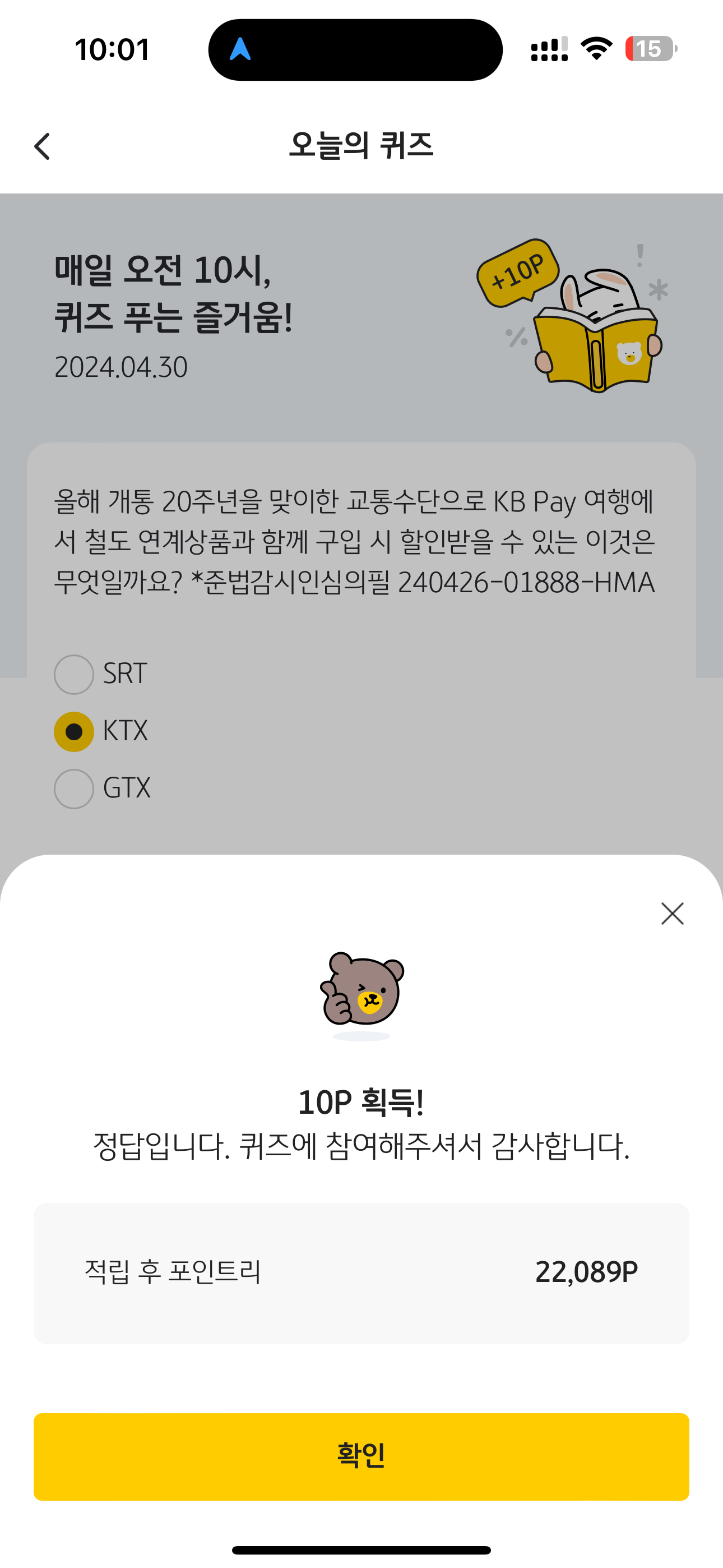KB Pay 오늘의 퀴즈 정답은 KTX 입니다