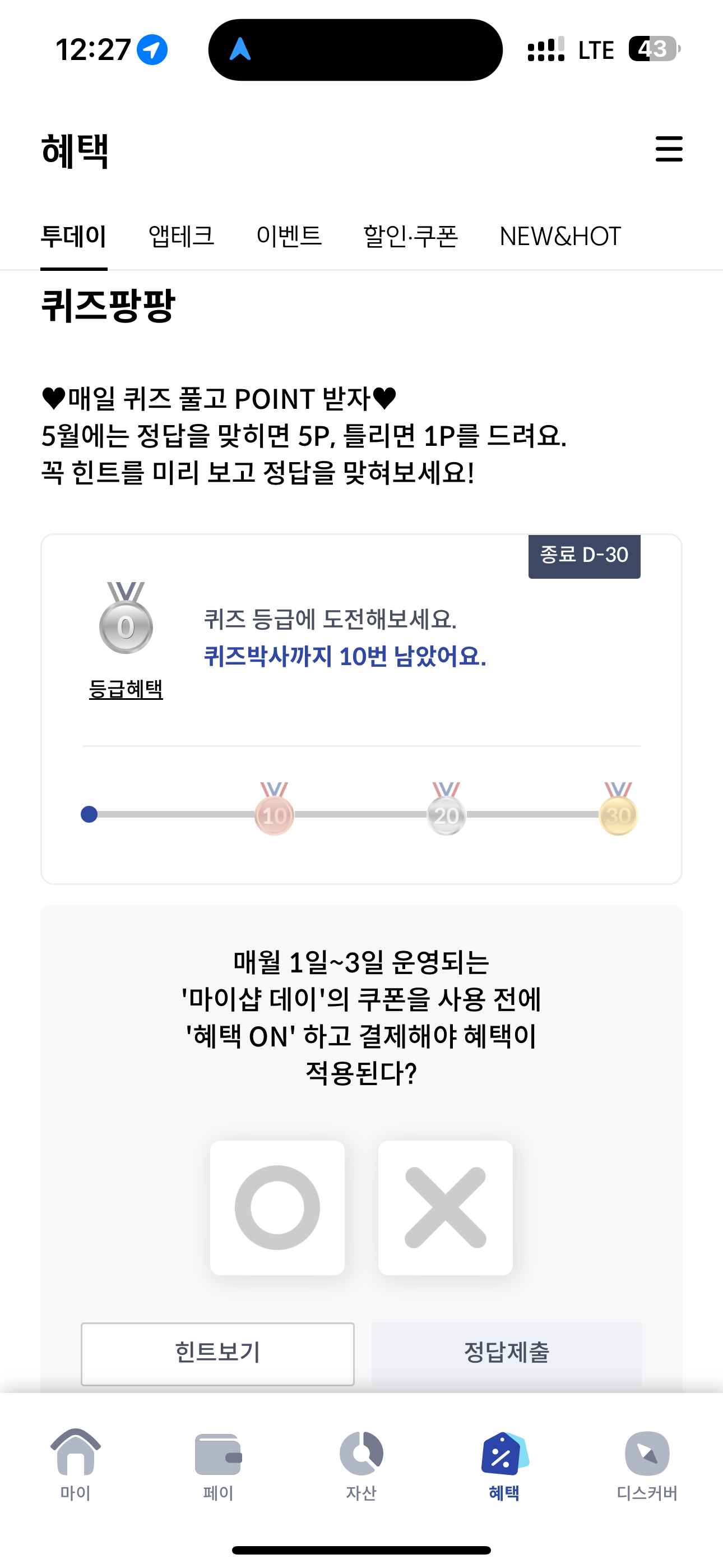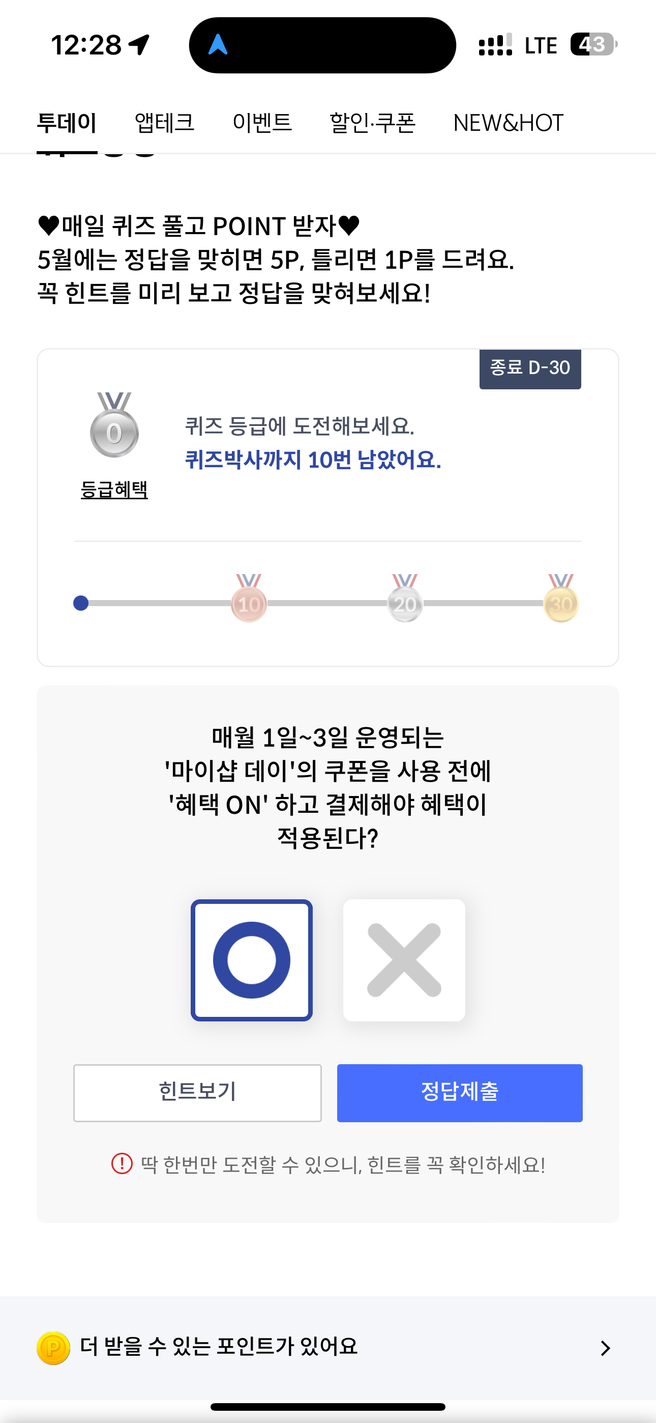 매월 1일~3일 운영되는 '마이샵 데이'의 쿠폰을 사용 전에 '혜택 ON'하고 결제해야 혜택이 적용된다? O, X 퀴즈인데요. 매월 초에 마이샵 데이 쿠폰으로 다양한 혜택을 누릴 수 있습니다. 이번 달은 어떤 혜택이 주어졌을까요? 혜택ON을 하고 이용해야 할까요? 지금 바로 확인해 보세요